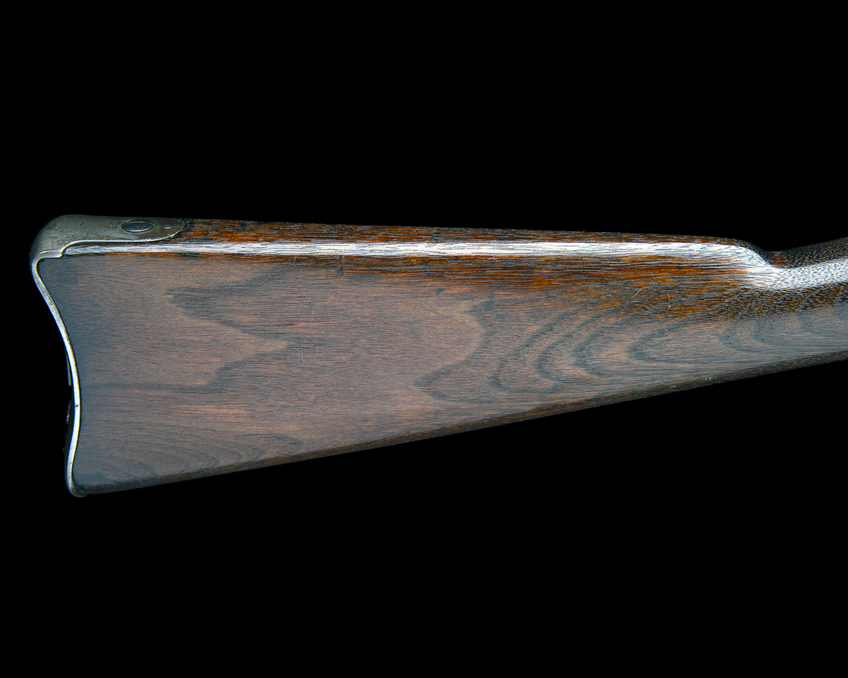partial serial number as first half obscured, with blued nitro reproved 22in. barrel, block and blade fore-sight, elevating ladder rear-sight, hinged breech-block marked 'US MODEL 1884', bar-action lock marked with an American eagle alongside 'U.S. SPRINGFIELD', side hammer, walnut half-stock, iron furniture including a barrel-band and heel-plate, swinging trapdoor in the heel-plate concealing aperture for cleaning rods (not present), no provision for clearing rod, traces of finish, fitted with side-bar and saddle-ring