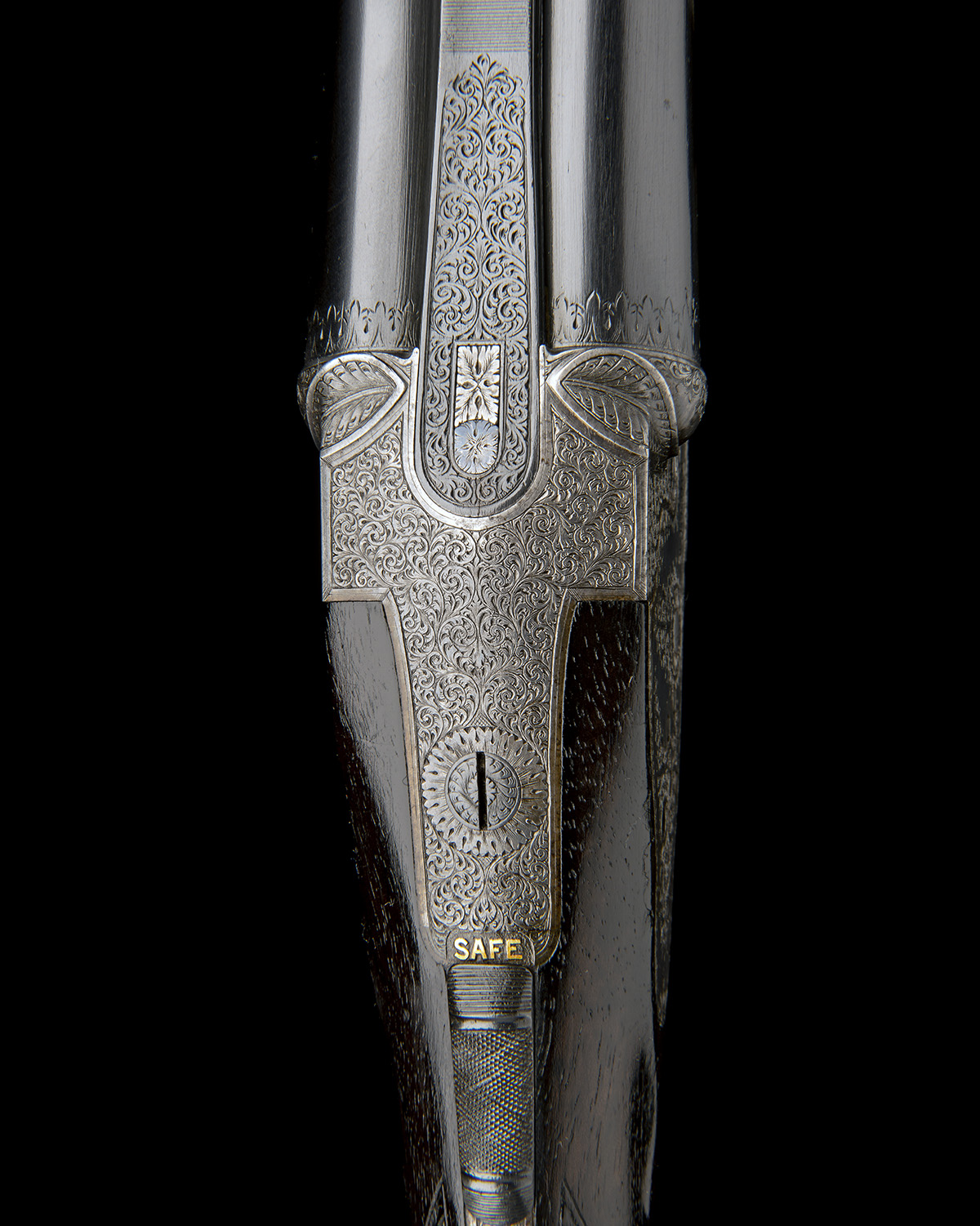26in. black powder only barrels, raised file cut rib engraved in gothic script 'JOHN RIGBY & CO. DUBLIN & LONDON', open sights with folding leaf sight with white metal sight lines and marked for 150 and 250 yards, ramped bead fore-sight, treble-grip action incorporating J. Rigby and T. Bissell patent rising third bite, patent no. 1141 of 1879, use number 392, the action face numbered 2061, underlever cocking, carved leaf fences, removable striker discs (left striker missing), automatic safety with gold-inlaid 'SAFE' detail, dipped-edge lockplates, fine acanthus scroll engraving, retaining some colour-hardening and likely renewed finish, light damage to bar forward of right lockplate, 14 5/8in. pistolgrip stock, the pistolgrip of two piece construction and with horn pistolgrip-cap, engraved sling button and chequered steel buttplate, fore-end with Rigby's patent lever release, weight 8lb. 15oz.