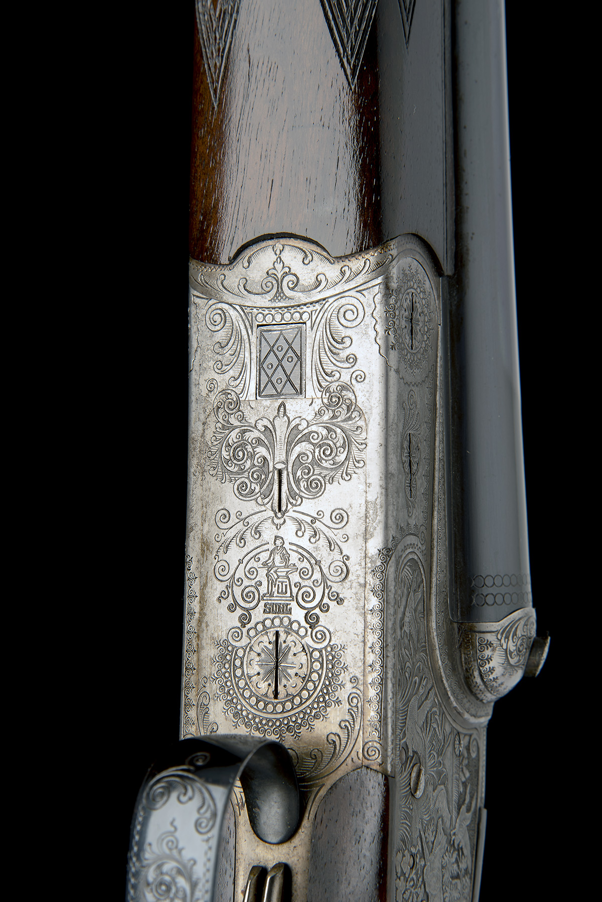 for 1966, 28 3/8in. (72cm) nitro reproved barrels (in 2020, partially struck off) with matt rib, 2 3/4in. chambers, bored approx. 3/4 and full choke, bolstered treble-grip action with side-clips, automatic safety, cocking-indicators, acanthus scroll engraving, the sidelocks with carved game scenes of fox and duck to the left and hound and partridge to the right, old silver finish overall, 14 3/8in. pistolgrip stock with cheekpiece, sling swivels and trade-marked buttplate, fore-end with Deeley & Edge patent release, weight 6lb. 15oz.