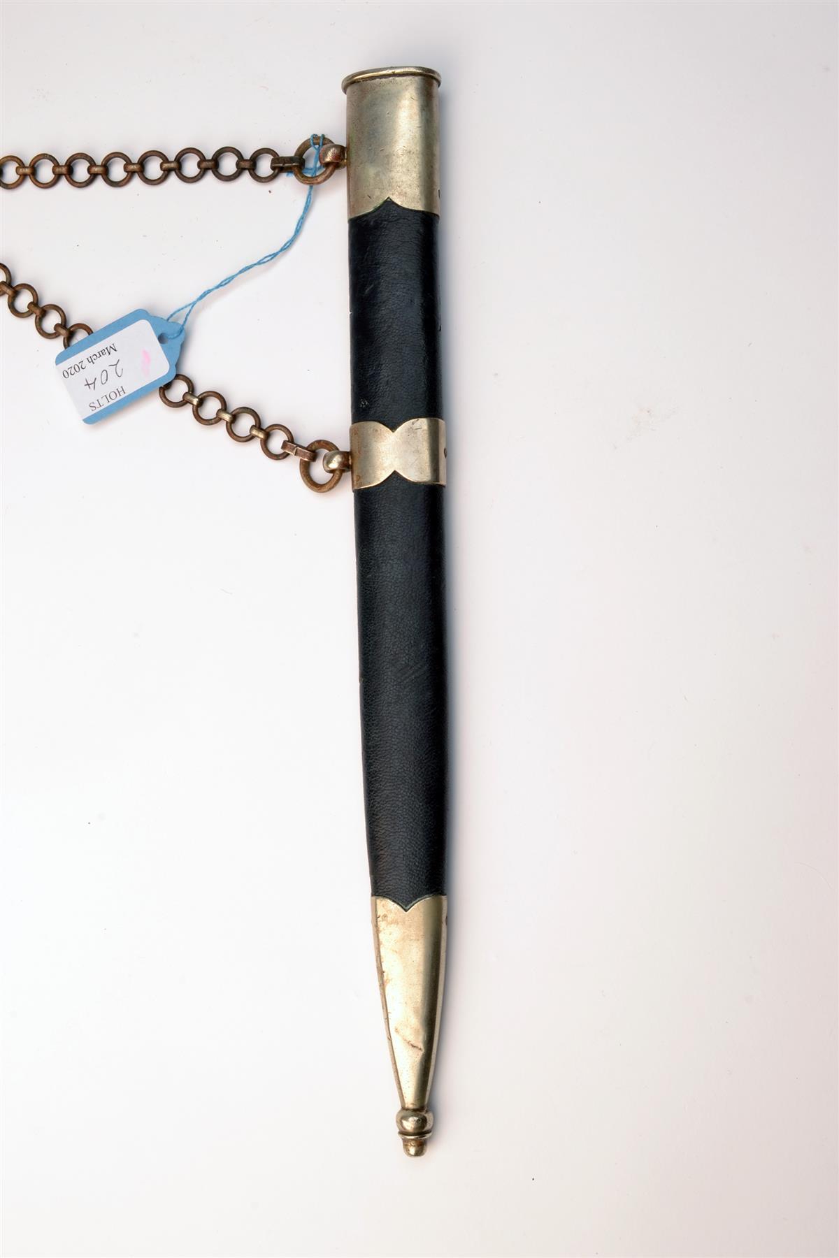 circa 1936, with 12in. double-edged blade etched with the maker's trademark at the forte and stamped with a 'waffenampt' style inspector's mark, solid nickel drooping cross-guard, wire-bound dark blue leather hilt, wheel pommel with bronze 'sunwheel' swastika inlay also repeated on the centre of the cross-guard, dark blue pebbled leather covered scabbard, nickel mounts and complete with its correct chain hanger