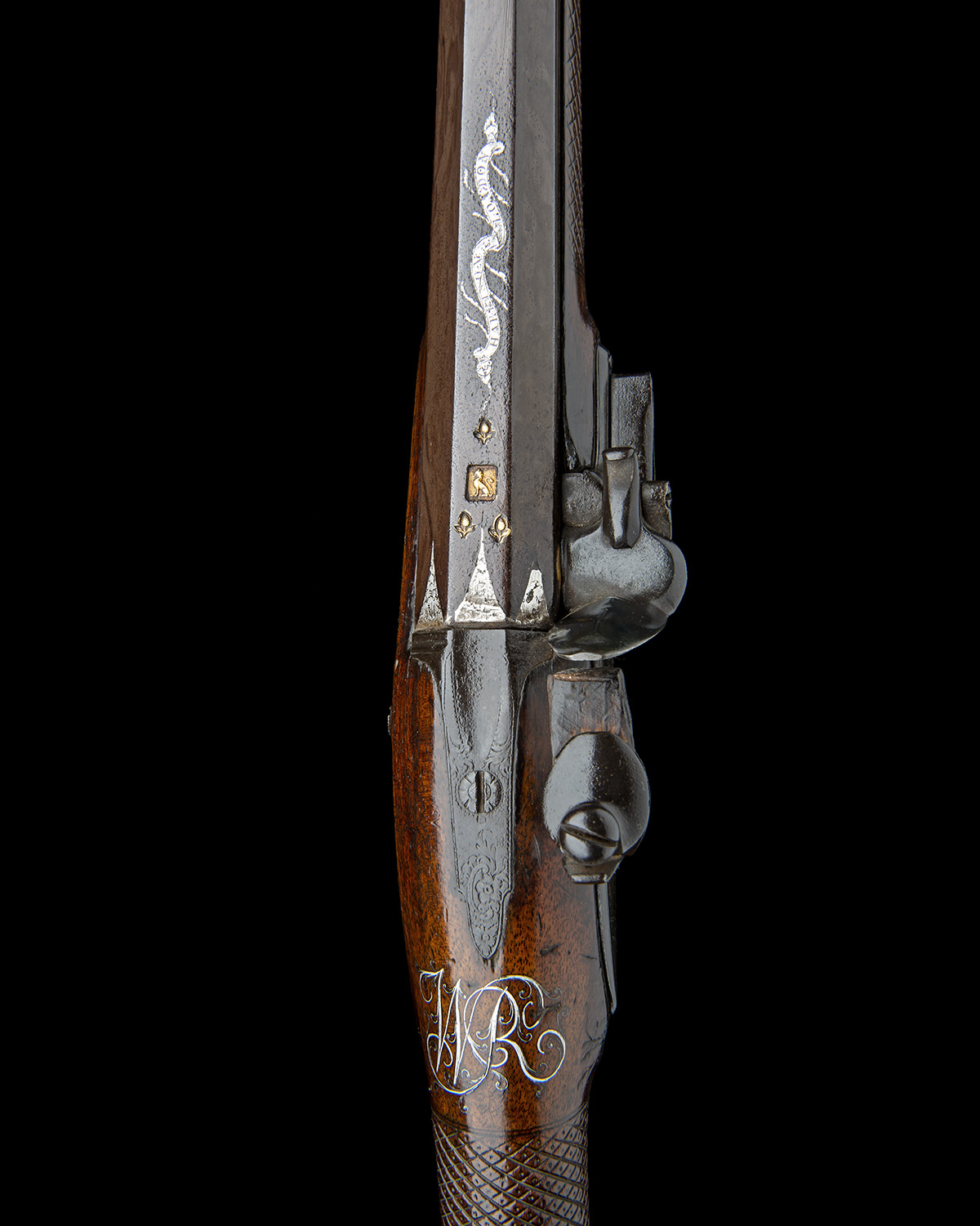 circa 1775, with 37in. two-stage barrel of Spanish form, the top-flat signed in a silver banner 'HARRISON, LONDON', three gold inlaid pineapple devices at breech arranged around a central gold poincon of a seated cat, applied silver fore-sight on a silver four-pointed starburst ground, between each point a small silver quatrefoil, carved band at the barrel intersection, the octagonal section inlet with engraved silver triangles to each flat, repeated in reverse at breech, engraved iron top-tang with shallow sighting groove, plain bevel edged lock with stepped and pointed tail and signed beneath the gold lined pan (signature rubbed and illegible), dot and square chequered walnut hand-rail half-stock with silver wire inlet monogram behind top-tang, silver skeletal heel-plate, the top-spur terminating in a silver eagle, silver trigger guard bow, the finial in the form of a silver hunting dog in a woodland setting, silver fully carved and engraved sideplate featuring an eagle against a rococo ground flanked by martial trophies, detachable fore-end probably cut back from full and with an engraved silver band at tip and shaped barrel key escutcheons, full length silver under-rib with silver ramrod throat and two further pipes and working replacement ramrod