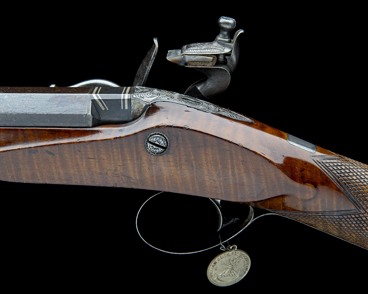 circa 1825, with re-browned fine damascus octagonal to sixteen sided to round 32 1/2in. barrel banded at the intersection, bead fore-sight, the top-flat signed 'W. SMITH PRINCES STREET LONDON', squared breech with four platinum bands, flat slightly curved border and scroll engraved lock, the scrolls inhabited by mythical beasts and further marked 'PATENT 2048' and signed 'WILLIAM SMITH PRINCES STR.T LONDON', engraved slab-sided cock with fully engraved top-jaw, special patent recumbent pan, re-faced steel and roller spring, walnut half-stock chequered at the wrist, engraved brushed bright iron furniture, white metal fore-end cap and mahogany under-barrel ramrod, complete with its W. Keith Neal collection medallion numbered 'G153'