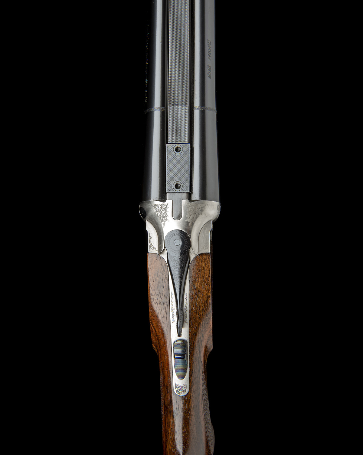 23 1/2in. nitro barrels with stepped raised solid matt rib, open sights with two folding leaf sights, ramped bead fore-sight, scroll-back treble-grip action with side-bolsters, removable striker discs, manual safety, Germanic scroll engraving, bright and blued finish overall, 15in. pistolgrip stock including 1/2in. rubber recoil pad, with cheekpiece, pistolgrip-cap and sling swivels, weight 11lb., in a universal case and with original paperwork