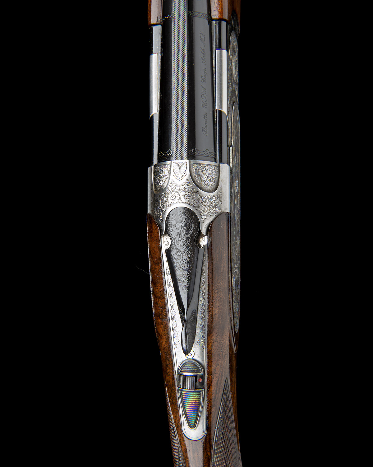 28in. nitro barrels with 6mm ventilated matt top-rib, 3in. chambers, bored approx. imp. cyl. and 1/4 choke, hold-open toplever, automatic safety with integral barrel selector switch, gold-washed trigger, floral and acanthus scroll engraving, the decorative sideplates with game scenes of pheasant and woodcock, the underside with the model designation in a cartouche, triggerplate signed 'Bottega C. Giovanelli', bright finish, 14 1/2in. figured pistolgrip stock including 3/8in. rubber recoil pad, weight 6lb. 6oz.