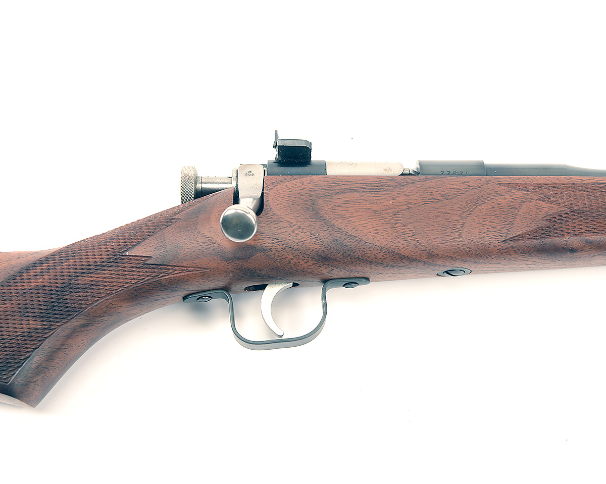 16 1/4in. nitro reproved barrel, adjustable rearsights, ramp-mounted blade fore-sight, miniature receiver ring engraved with a chipmunk motif, bolt with manual cocking knob, figured pistolgrip stock with monte carlo comb, buttplate, 11 3/4in. pull, weight 2lb. 9oz., in its nylon slip with chipmunk logo leather patch