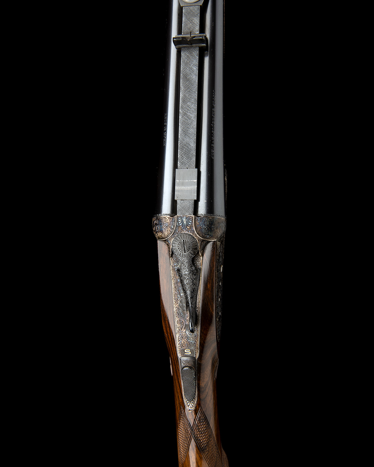 23 3/4in. nitro chopperlump barrels (dated to 1978) with solid raised matt rib, open sights and ramped bead fore-sight, the breech end mounted with a Zeiss Diavari-C 1,5...4,5x18 telescopic sight, serial no. 202065, in quickly-detachable mounts, treble-grip action with hidden third bite, removable striker discs, engine turned action flats, automatic safety, gold-inlaid cocking-indicators, articulated front trigger, acanthus scroll engraving with floral bouquets, retaining much original colour-hardening and finish, 14 3/8in. pistolgrip stock with cheekpiece and including 1in. ventilated rubber recoil pad, weight 8lb. 9oz. (unscoped) and 9lb. 11oz. (with scope)