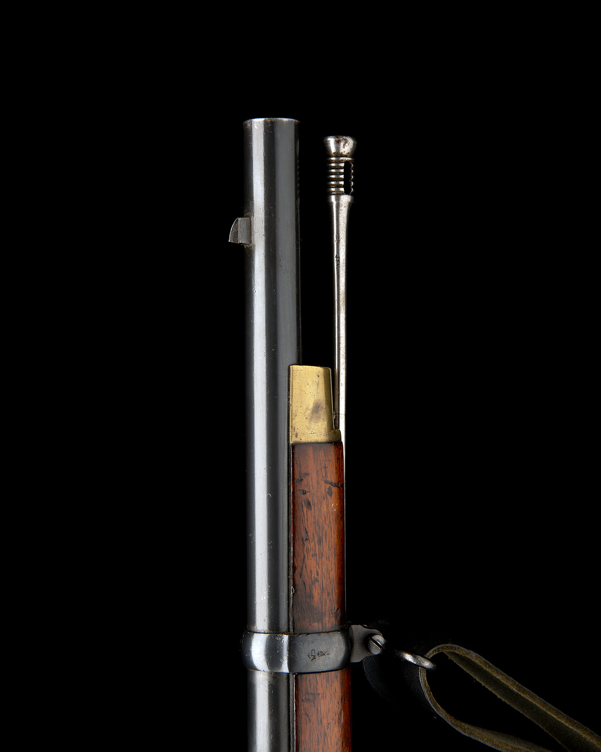 dated for 1870, with 36 1/2in. blued barrel, block and blade fore-sight, elevating ladder rear-sight, side of breech marked 'STEEL', flip open breech-block, colour hardened lock with signature to the bar and a 'V.R.' crown device to tail, flat faced hammer nose, walnut full-stock with brass and iron furniture, jag-ended clearing rod and later leather sling