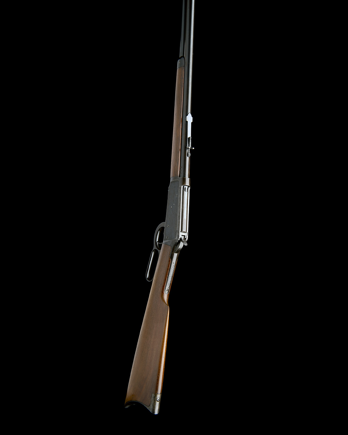for 1903, with round 26in. nitro proved barrel, nickel-bladed fore-sight, buckhorn rear-sight, makers signature to top of barrel with patents to '1894', calibre designation and Winchester proof marks at breech, slab-sided receiver, model designation to top-tang, walnut straight hand stock (small hairline crack alongside top-tang), crescent heel-plate, swivel hole plugged, plain trigger and finger-lever, walnut beavertail fore-end and full length under-barrel magazine, strong amount of original but faded finish remaining