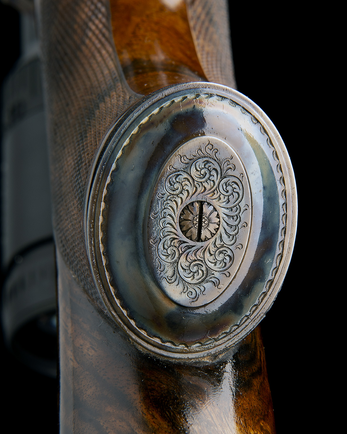 24 5/8in. nitro reproved (in 2020) Krupp-steel octagonal to round barrel with raised integral matt rib, gold-line detailing at the knox-form, open sights with gold-inlaid sight line and marked '100', ramped blade fore-sight, the receiver (with thumb cutout) mounted with a Zeiss Victory Diavari 2,5-10x50 T* telescopic sight, serial no. 3183053, in quickly-detachable mounts, colour-hardened bolt with progressive radial cut chequering and gold highlighting, safety with gold-inlaid 'F' detail, hinged floorplate with lever release, fine acanthus scroll engraving, the sidewall with 'DEUTSCHE WAFFEN-UND MUNITIONSFABRIKEN BERLIN', retaining virtually full original colour-hardening overall, very highly-figured pistolgrip stock with raised ovate side panels, cheekpiece, sling swivels, engraved and colour-hardened steel pistolgrip-cap, the fore-end with crosspin release, 14 1/2in. pull including 5/8in. leather covered recoil pad, weight 8lb. 1oz. (unscoped) and 9lb. 9oz. (with scope)