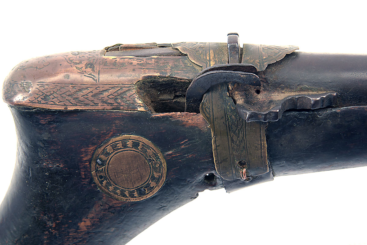 AN INDO-PAKISTANI 28-BORE MATCHLOCK JEZAIL, with 48 1/2in. barrel flared at the muzzle, hardwood half-stock, sheet metal decoration and reinforcement, fan-tailed butt and hatchet trigger