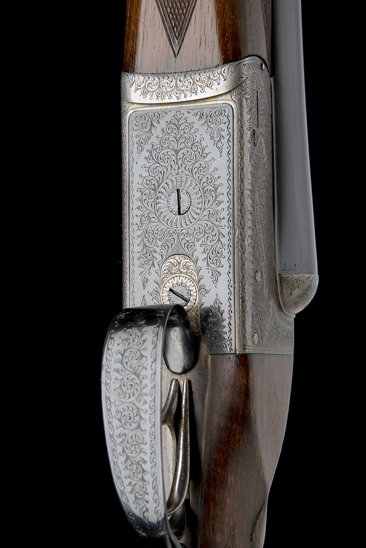 circa 1936, 28in. nitro barrels, rib engraved 'JOHN ROBERTSON. 41 ALBEMARLE STREET. LONDON. W.', 2 1/2in. chambers, bored approx. true cyl. in both, automatic safety with gold-inlaid 'SAFE' detail, acanthus scroll engraving with scrolled banners engraved 'JOHN ROBERTSON', retaining traces of original colour-hardening, 15in. semi-pistolgrip stock, the comb with wooden insert (cheekpiece removed), slightly cast on and including 3/4in. rubber recoil pad, weight 7lb.