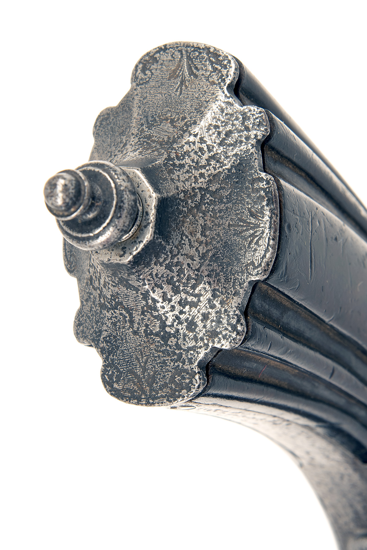 circa 1880, with round 10 1/2in. barrel signed in gilt 'PAUL GIFFARD INVENTEUR BREVETS', dove-tailed blade fore-sight, adjustable tangent rear-sight, provision for CO2 reservoir cylinder beneath the barrel (absent), action engraved with scrollwork, lever-action tap with circular breech for ball, central exposed hammer, walnut fluted grips (some shrinkage), borderline engraved grip-strap, moulded iron spire pommel-cap, iron trigger-guard with finger-spur and adjustable trigger, the whole shallow frosted with some slightly deeper pitting throughout, 18in. overall, weight approximately 2 1/2lbs.
