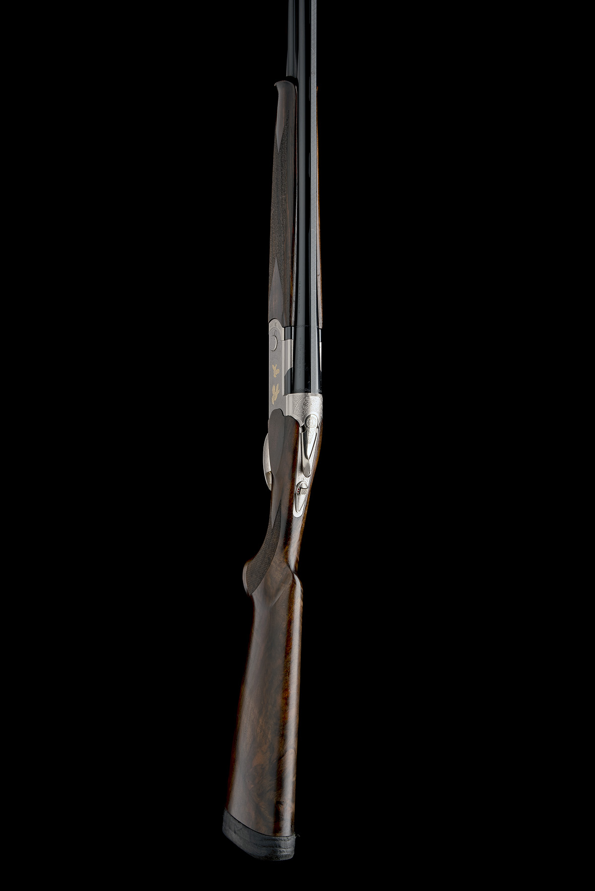 dated 2007, 28in. nitro barrels with 6mm ventilated matt top-rib, 2 3/4in. chambers, multichokes (no spares), hold-open toplever, automatic safety with integral barrel selector switch, gold-washed single trigger, acanthus scroll engraving surrounding gold-highlighted scenes of game in flight, the underside with the Beretta logo in gold, brushed finish, 15in. pistolgrip stock (possible replacement) including 1in. rubber recoil pad, fore-end cracked and repaired, weight 6lb. 7oz.