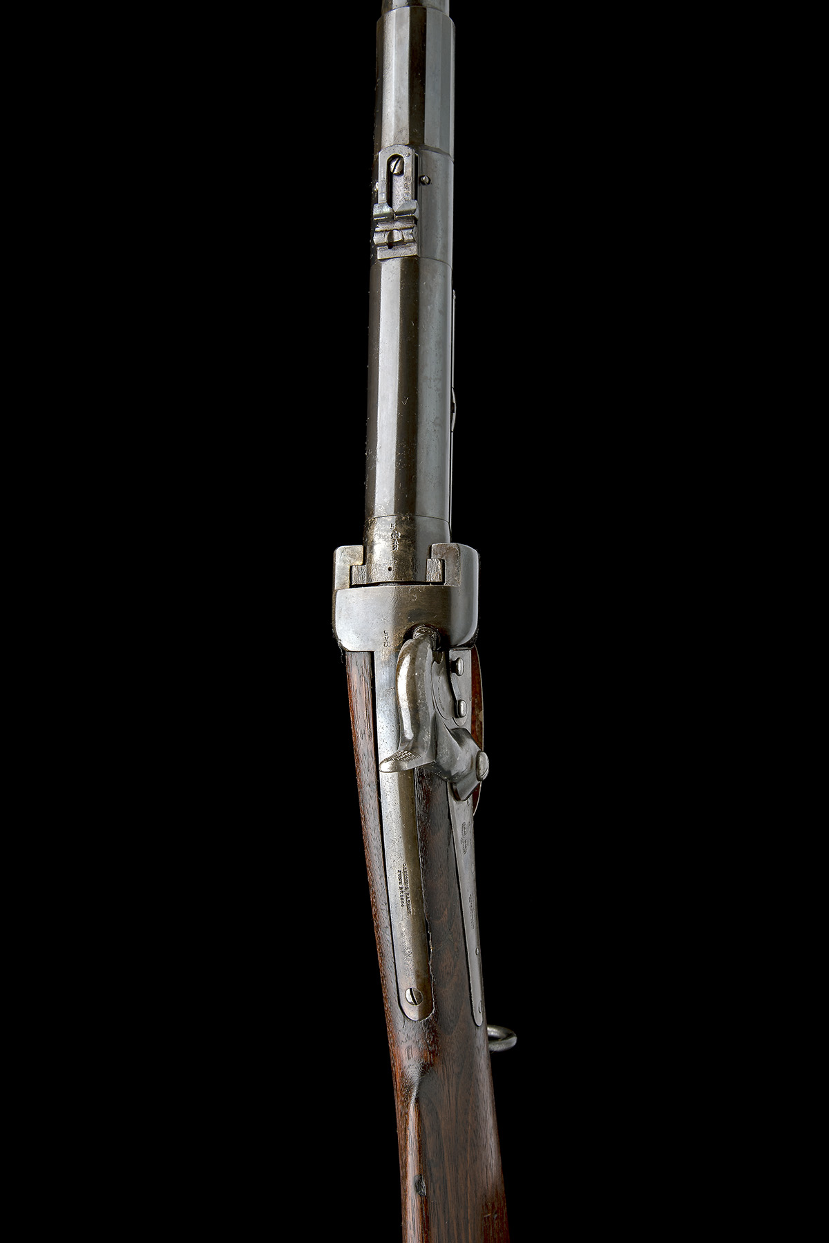 dated for 1856, with blued tapering round 18in. barrel, dove-tailed block and blade fore-sight, elevating ladder rear-sight, central section of outer barrel faceted for grip, plain receiver, long plain top-tang marked 'GREENE'S PATENT JUNE 27 1854', back-action lockplate fitted with 'Maynard's' tape priming system and marked 'MASS. ARMS CO. CHICOPEE FALLS USA 1856' a 'VR' crown cypher and 'MAYNARD'S PATENT SEPT 22 1845', plain hammer, walnut butt-stock (repair at head) with iron patch-box and semi-crescent heel-plate, saddle-ring to the trigger-guard tang, large trigger-guard bow with two triggers, the front one unlocking the barrel for loading, ordnance stamps and no provision for fore-end, the whole an older refinish with much remaining, overall length 34 1/2in., weight approximately 7lbs.
