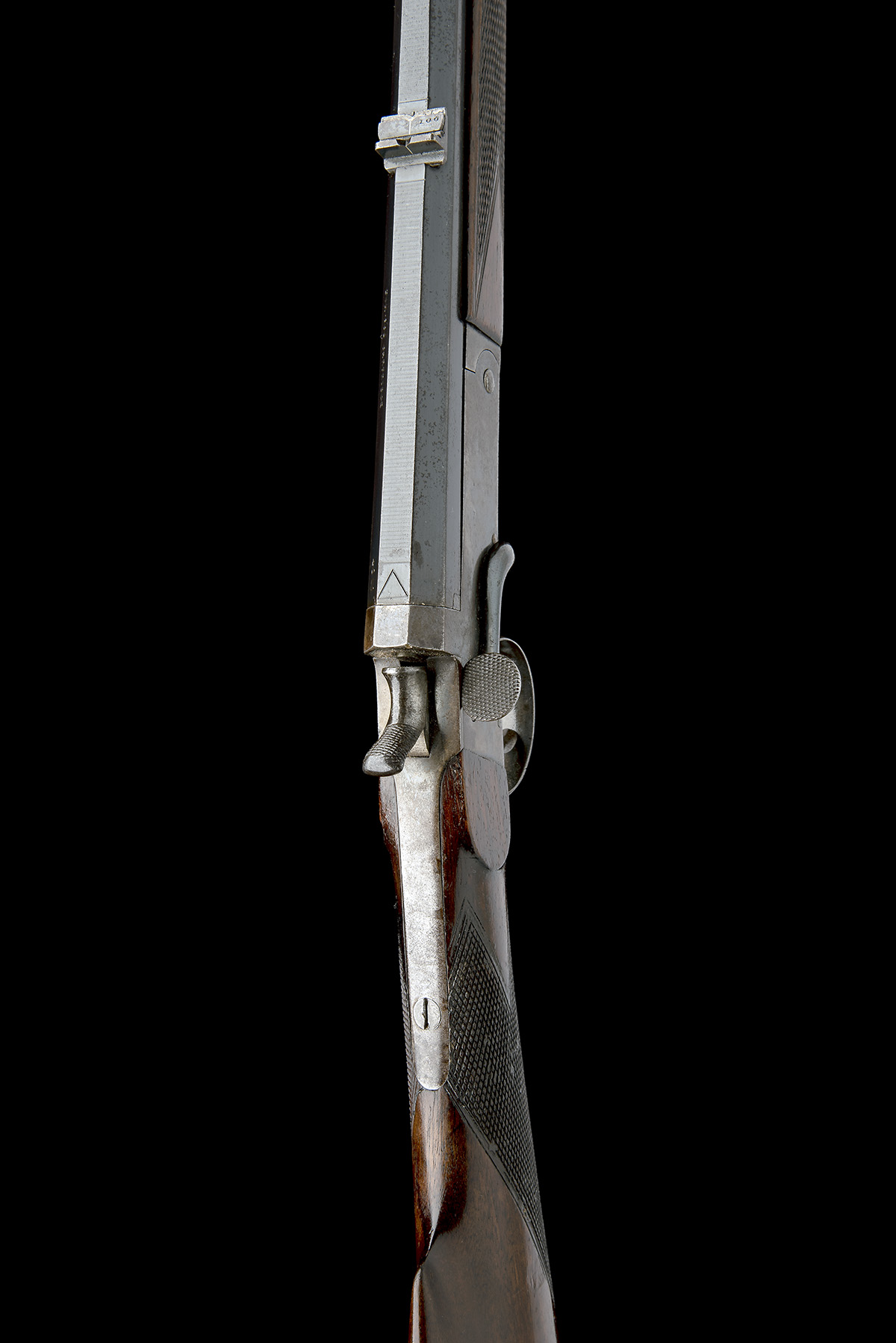 circa 1895, with blued octagonal 26 1/2in. barrel, dove-tailed bead fore-sight, standing notch rear-sight with two additional folding leaves, the matted sighting plane marked with a triangle trademark at breech, the left hand top-flat marked 'WESTLEY RICHARDS & CO, LONDON' and 'FOR .300 CARTRIDGE', plain slab-sided colour hardened receiver, the left face marked with the same address, side-lever opening, central hammer, chequered walnut straight-hand butt-stock ribbed at heel, guarded trigger and chequered walnut snap-on splinter fore-end, much original finish remaining, weight approximately 4 3/4lbs., overall length 42 3/4in.
