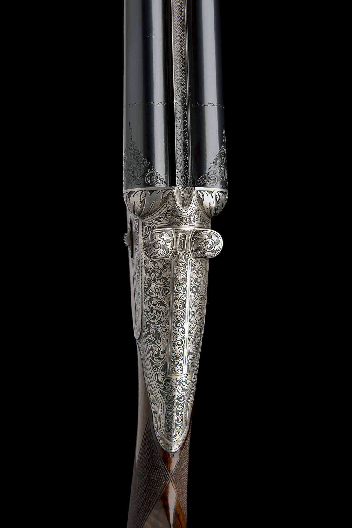 for 1978, 27 1/2in. (70cm) nitro monobloc barrels with matt top rib and no under rib, the breech ends with bold acanthus scroll detailing, 11 punch marks, 2 3/4in. chambers, bored approx. imp. cyl. and 1/2 choke, sprung sliding-breech with converging obturator discs, manual side safety, the underside with push button barrel release, bold bouquet and scroll engraving on a matted background, the fences carved in relief with stylised leaf designs, old silver finish overall, 15in. figured stock including pale horn buttplate, the fore-end with dark horn finial, weight 6lb. 8oz.