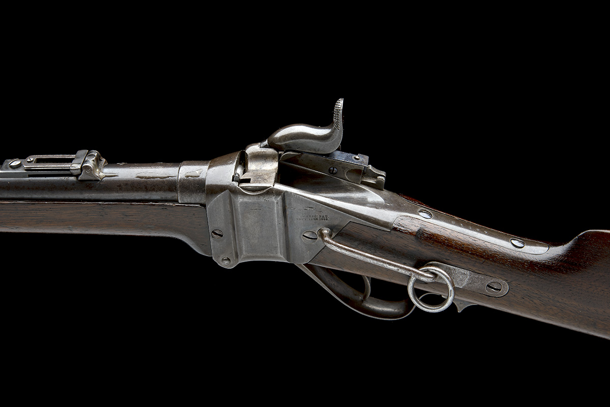 or '1867 Model', converted circa 1867, with original 22in. six-groove barrel, block and blade fore-sight, folding ladder rear-sight, 'NEW MODEL 1859' stamped at breech, vertical dropping block receiver with sprung firing pin, the lockplate with redundant in-built pellet primer and marked 'R.S. LAWRENCE PAT. APRIL 12TH 1859', the body of the lock marked 'C. SHARPS PAT. OCT. 5TH 1852', straight hand walnut butt-stock, no provision for patchbox, a possible collection identity stud fixed centrally just forwards of the iron heel-plate on the left side embossed '6', under-lever opening, saddle-ring mounted to left hand side of the receiver, the left of receiver marked 'C. SHARPS PAT SEPT 12TH 1848', walnut splinter fore-end and single iron barrel-band, overall length 39in., weight approximately 8lbs.