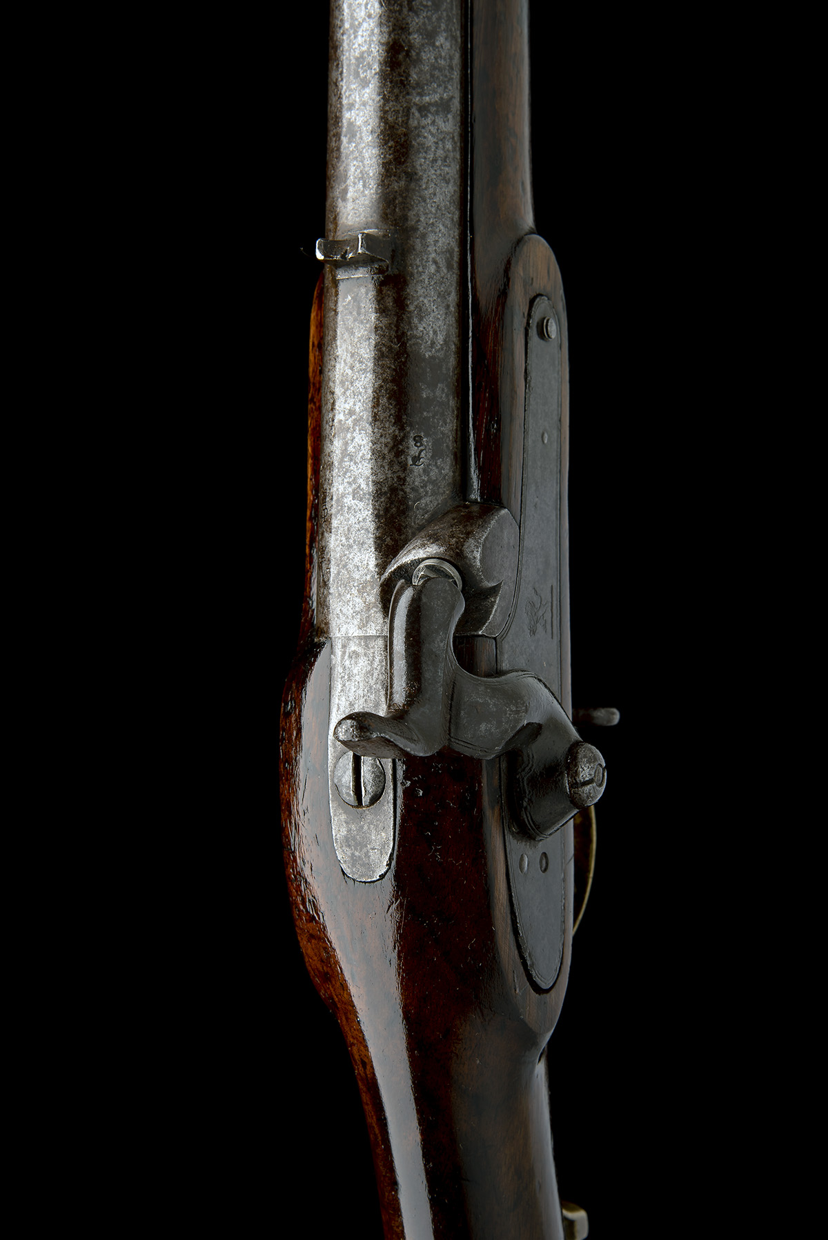 circa 1845, with round iron 39in. barrel (stained), block fore-sight, standing notch rear-sight, solid rounded top-tang, borderline engraved lock marked with the rampant lion trademark of the East India Company, walnut full-stock (some armourer's patched repairs), brass furniture including lower tang with raised spur and iron under-barrel ramrod, overall length 54 1/2in., weight approximately 10lbs.