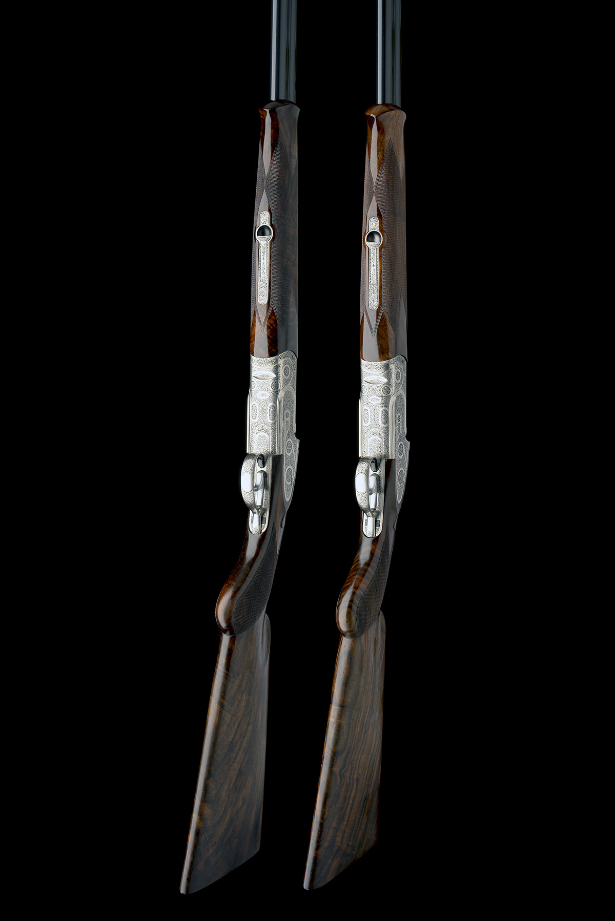 dated 1995, full Spanish codes 40-03-207-95 / 40-03-208-95, 30in. nitro barrels with 6mm ventilated matt top-ribs gold-inlaid '1' and '2', 2 3/4in. chambers, multichokes (with spares), hold-open toplevers gold-inlaid '1' and '2', automatic safeties, bouquet and scroll engraving, the decorative sideplates engraved en suite (blemish to No.2 left sideplate), 14 3/4in. figured semi-pistolgrip stocks, weight 7lb. 9oz. (No.1) 7lb. 7oz. (No.2), in an Emmebi double guncase