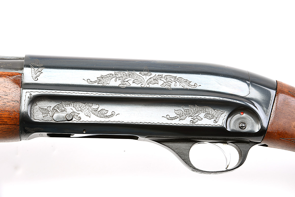 TULA 12-BORE 'MU-21-12' SEMI-AUTO SHOTGUN, serial no. N4703, circa 1974, restricted magazine, 29 1/2in. nitro barrel with 7mm raised ventilated matt rib, 2 3/4in. chamber, bored approx. full choke, sidelever safety, border and acanthus leaf engraving, blacked finish, 14 1/2in. pistolgrip stock including rubber recoil pad, with cheekpiece, sling swivels