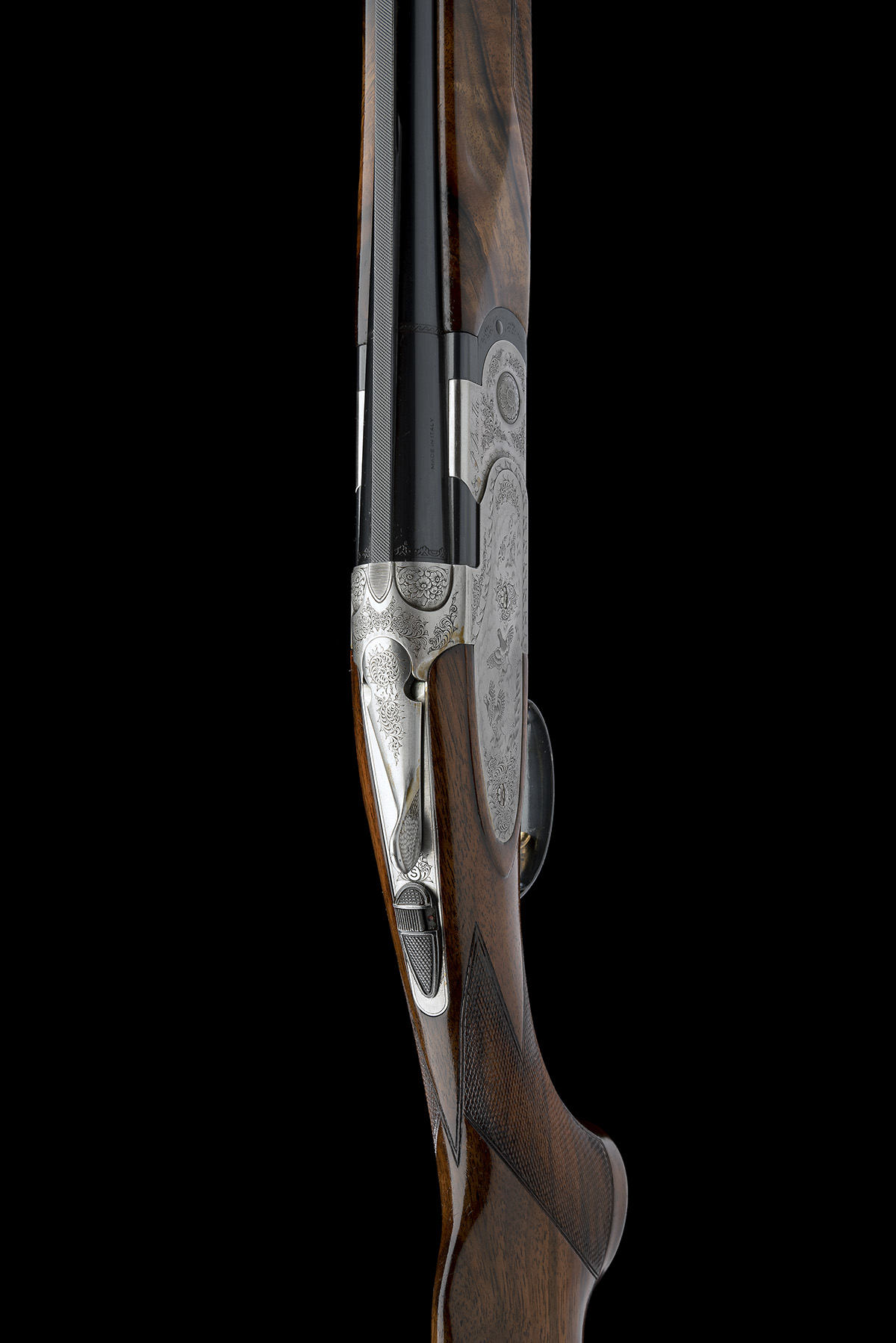 dated 1983, 28in. nitro barrels with 6mm ventilated matt top-rib, 2 3/4in. chambers, bored approx. imp. cyl. and 1/4 choke, hold-open toplever, automatic safety with integral barrel selector switch, gold-washed trigger, floral and scroll engraving surrounding game scenes of duck, partridge and woodcock in flight, triggerplate signed 'Bottega C. Giovanelli', bright finish overall, 14in. well-figured pistolgrip stock including trademark buttplate (broken at heel), weight 5lb. 14oz.