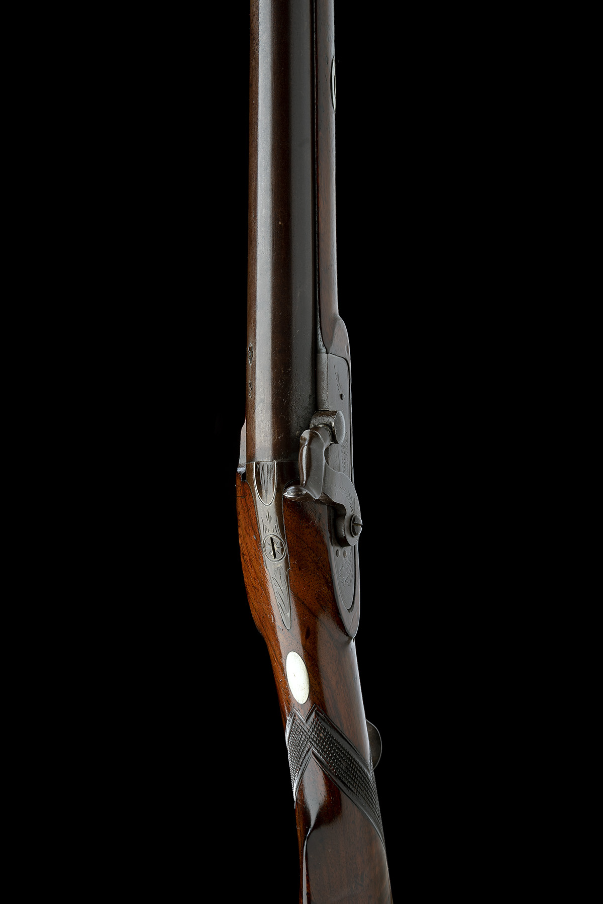 made for export circa 1850, with round 39in. browned barrel, Tower proofs (?), hooked breech, bead fore-sight, shallow sighting groove to the top-tang, square-fronted borderline engraved bar-action lock signed 'SAMUEL MOORE, WARRANTED' below the drum and nipple, sparse acanthus leaf engraved detail, walnut half-stock chequered at the wrist, iron furniture except white metal escutcheon behind top-tang, barrel-key escutcheons and ramrod throat and original under-barrel ramrod (worm tip missing)