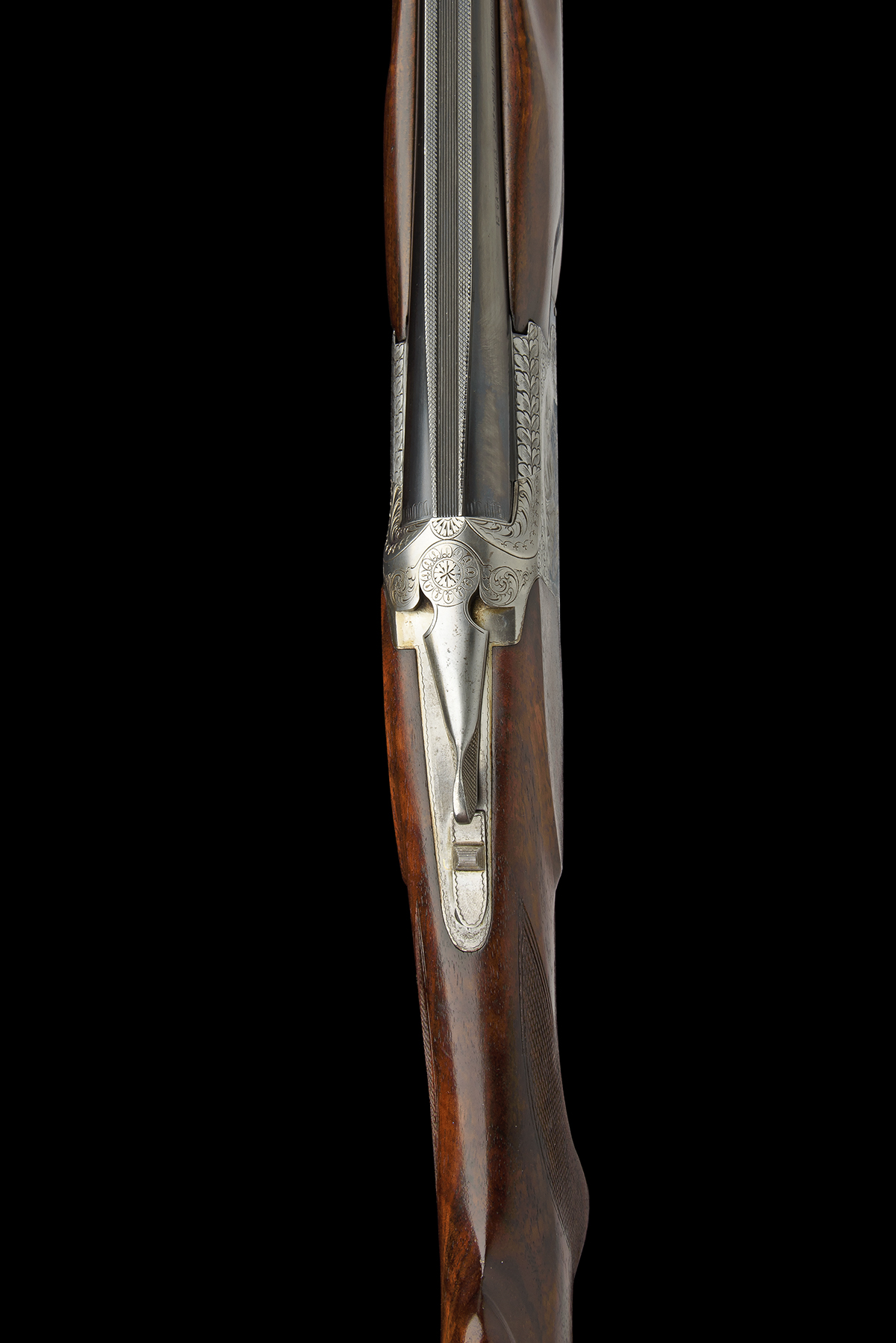 for 1986, 30in. nitro barrels with 12mm ventilated matt top-rib, 2 3/4in. chambers, bored approx. 1/2 choke in both, hold-open toplever, manual safety with integral barrel selector switch, gold-washed single trigger, border and acanthus scroll engraving surrounding game scene vignettes, matt silver finish, 14 1/2in. pistolgrip stock including 1in. ventilated rubber recoil pad, weight 7lb. 7oz.