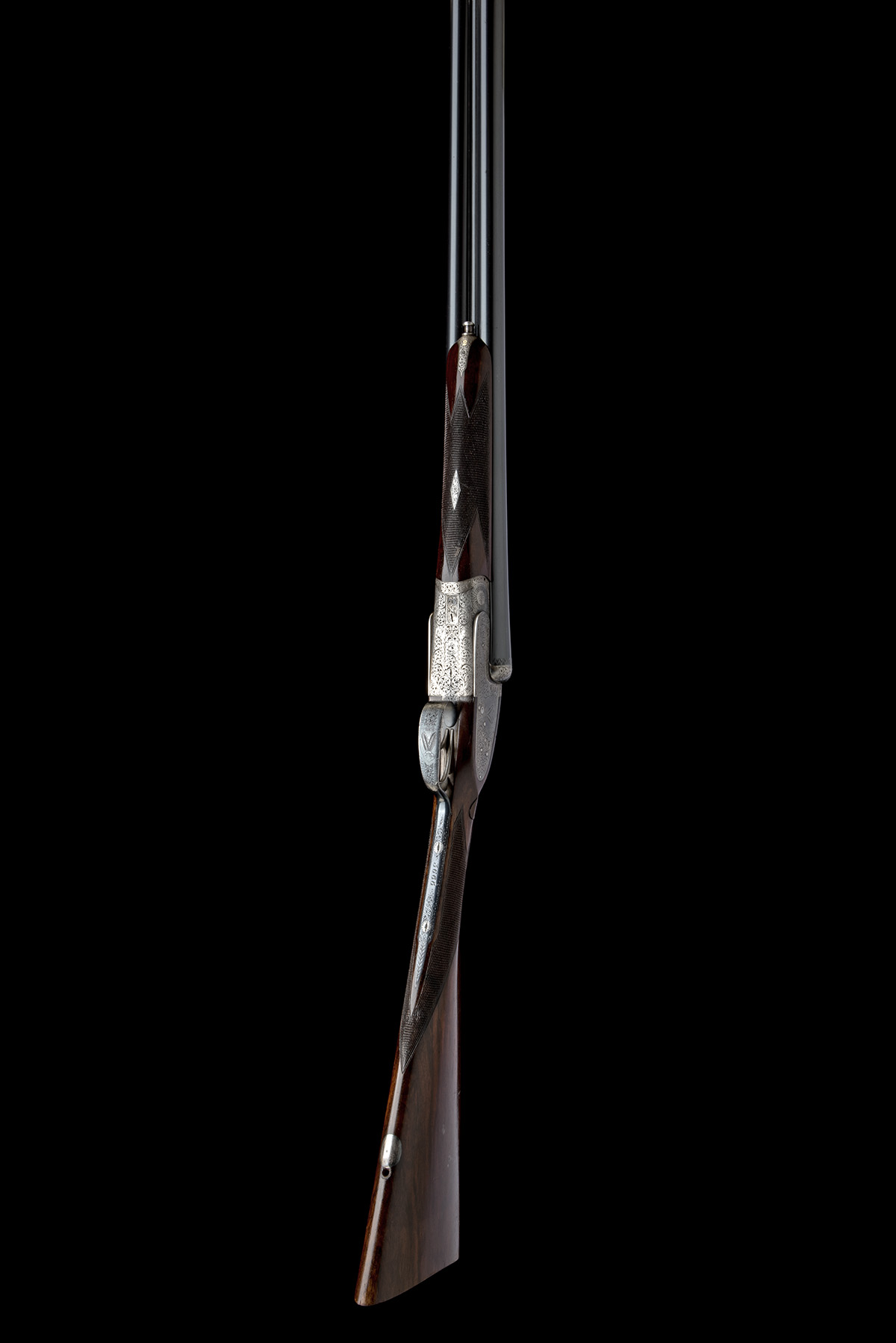 for 1929-30, 26in. nitro reproved barrels (in 2025), the rib engraved 'CHARLES HELLIS & SONS. 119 EDGWARE ROAD. HYDE PARK. LONDON. W.' the breech end gold-inlaid '2' surrounded by acanthus scroll detailing, 2 3/4in. chambers, bored approx. 1/2 and full choke, treble-grip action, toplever gold-inlaid '2', automatic replacement safety with gold-inlaid 'SAFE' detail, beaded border and bold scroll engraving, the lockplates and triggerguard with a crossed feather motif, the makers name in a scrolling banner, retaining very slight traces of original colour-hardening and finish, 14in. stock, fore-end finial gold-inlaid '2', weight 6lb., in a case