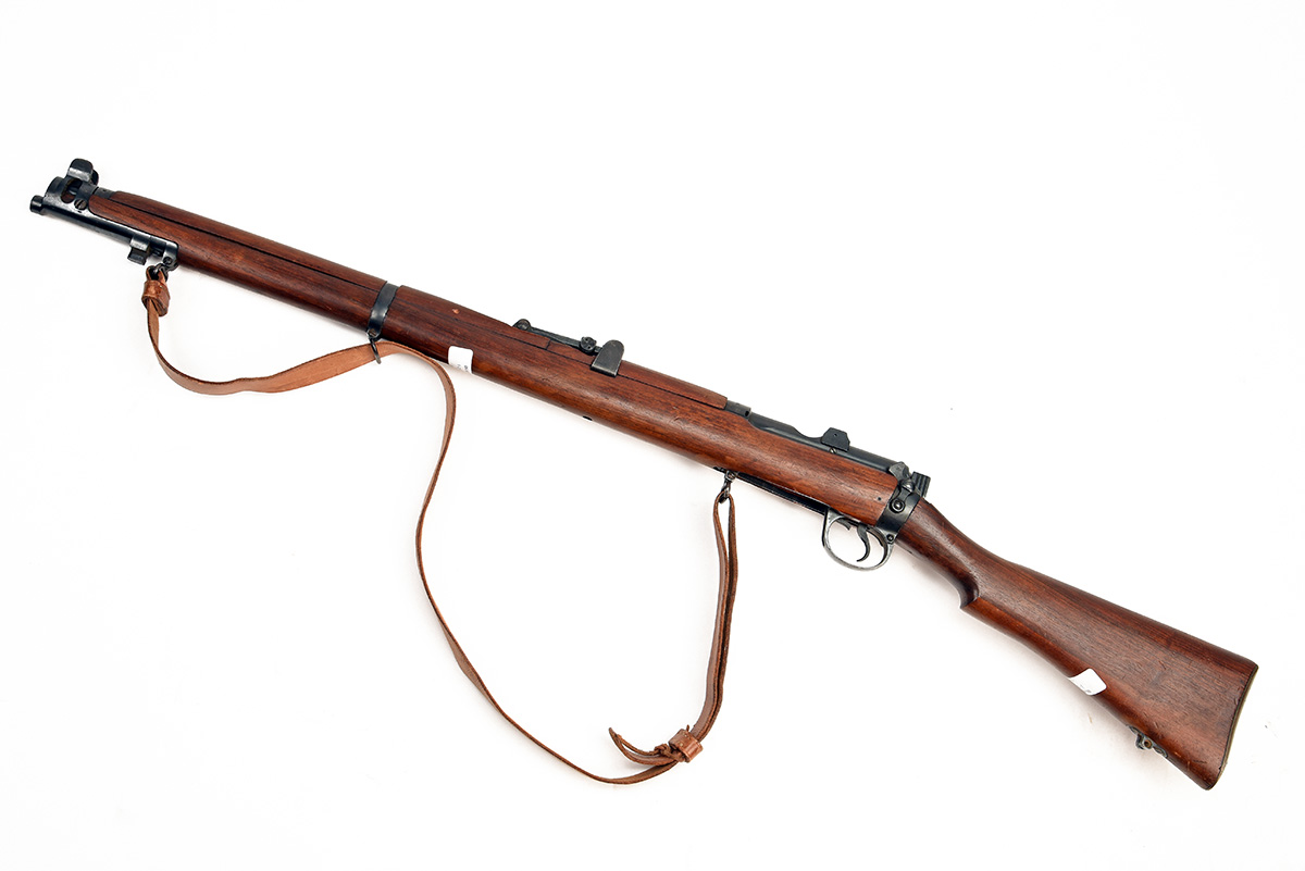 * B.S.A. CO. .303 'S.M.L.E.' BOLT-MAGAZINE SERVICE RIFLE, serial no. 48349, circa 1914, 25 1/4in. nitro barrel, protected ramp-mounted fore-sight, tangent rear-sight, manual safety, detachable magazine missing, full-length stock with trap door, leather sling