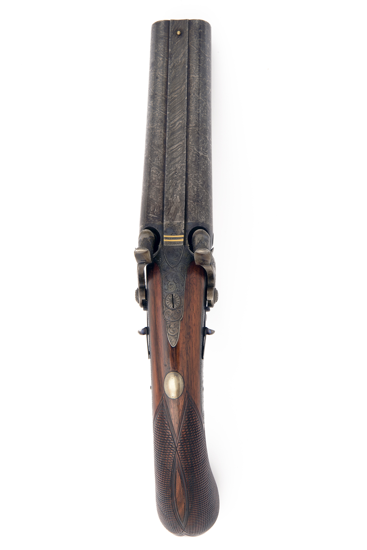 with 5 1/2in. browned barrels the top rib inscribed 'LONDON', and with two inlaid gold lines at breech, and fitted with a swivelling hinged rammer at muzzle, foliate engraved fixed breech, border decorated curved back-action locks superbly scroll engraved and bearing makers name 'J. A. BLAKE & Co', the hammers engraved to match, both locks are fitted with bolt safeties, figured full walnut stock with chequered bag shaped grip, iron trigger-guard with foliate engraved bow having virtually all its original charcoal blue finish, with almost all its original finish and case colours to fixed breech, locks and hammers, brown to barrel, contained in its original brass cornered mahogany green baize lined and partitioned case, the lid with original trade label 'I. A. BLAKE & CO / GUN MAKERS &C / 253 WAPPING', accessories include a pincer ball mould, copper bodied flask, nipple key, cleaning rod