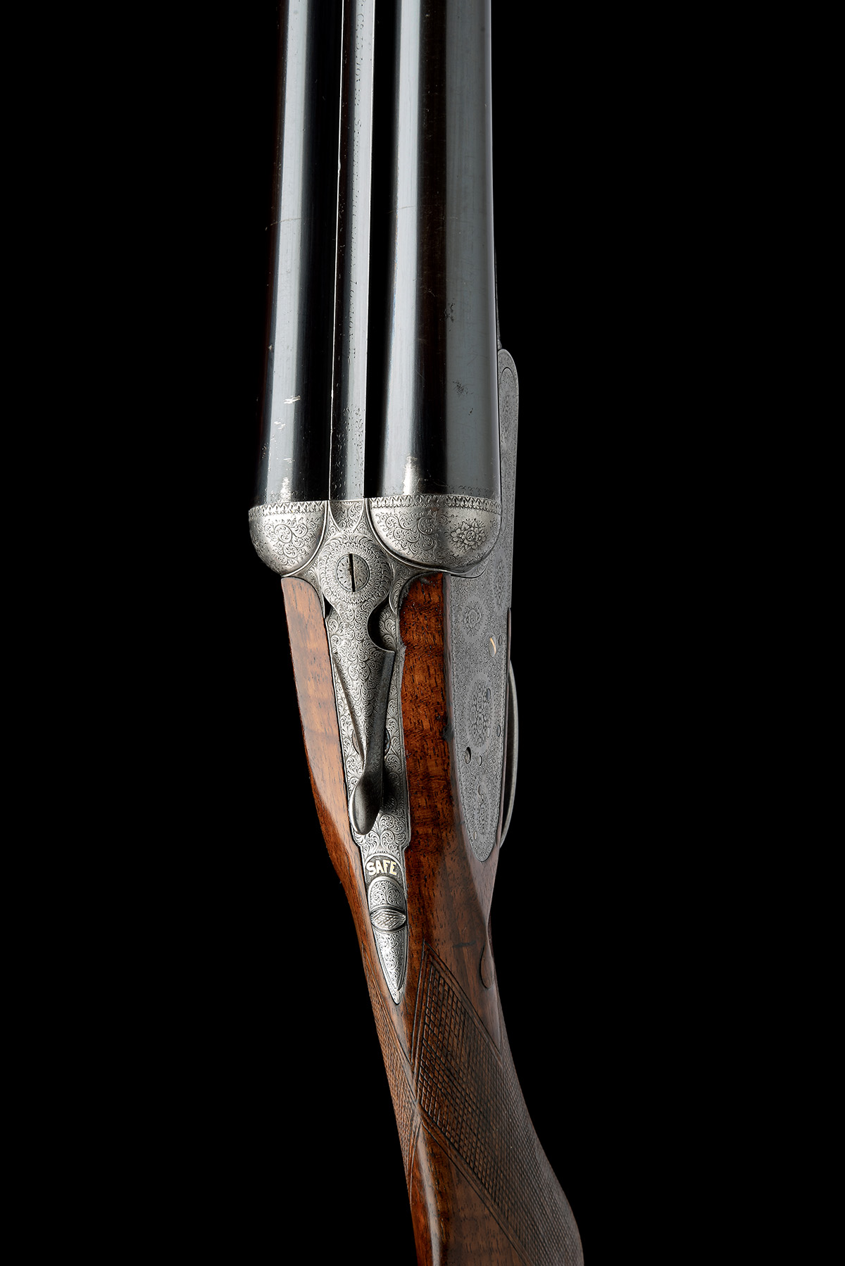 for 1900, 29in. sleeved nitro barrels retaining original rib (engraving worn illegible), 2 1/2in. chambers, bored approx. imp. cyl. and 1/4 choke, automatic safety with gold-inlaid 'SAFE' detail, gold-inlaid cocking-indicators, Boss 1905 improved patent single trigger, rolled-edge triggerguard, fine border and acanthus scroll interspersed with floral bouquets, engraved 'BOSS'S PATENT' and with 'BOSS & CO.' engraved within a scrolling banner, the triggerplate engraved 'BOSS'S PATENT NO 11278', 15 1/2in. replacement semi-pistolgrip stock (original fore-end wood with some losses), weight 6lb. 14oz.