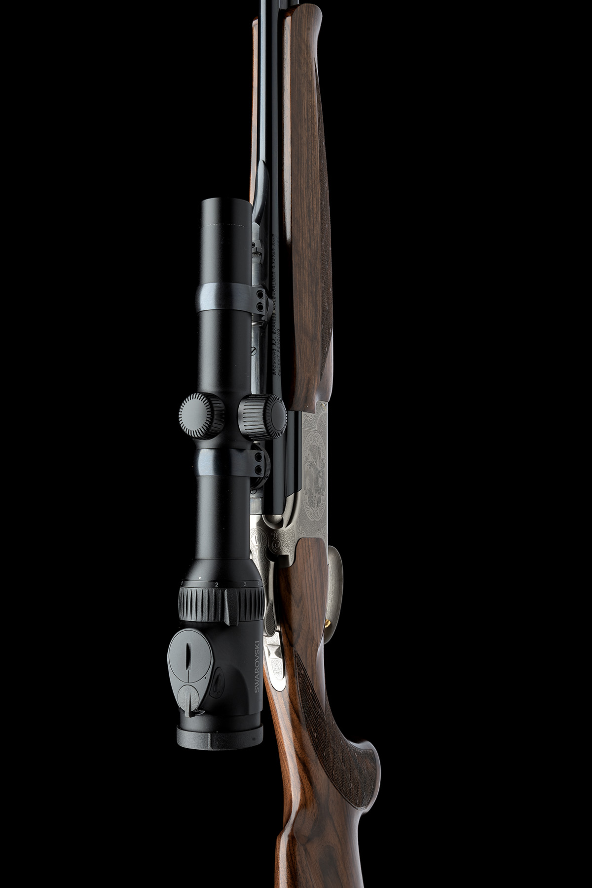 for 2013, 22 1/8in. nitro barrels with matt sight rib, open sights and ramp-mounted high visibility bead fore-sight, the breech end mounted with a Swarovski Z6i 1-6x24 telescopic sight, serial no. R843634936, in quickly-detachable mounts (original box supplied), hold-open toplever, manual safety, gold-washed trigger, acanthus scroll engraving surrounding game scenes of deer and wild boar, satin finish, 14 3/4in. figured pistolgrip stock with sculpted cheekpiece, sling eyes and buttplate, weight 7lb. 12oz. (unscoped) and 9lb. 2oz. (with scope), in its universal case (no provision for telescopic sight)