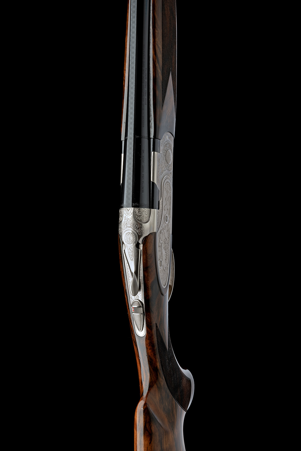 dated 2002, 28in. nitro barrels with 6mm ventilated matt top-rib, 3in. chambers, bored approx. imp. cyl. and 1/2 choke, hold-open toplever, automatic safety with integral barrel selector switch, gold-washed single trigger, engraved with foliate scroll, the decorative sideplates carved in relief with scenes of pheasant flushed from their naturalistic habitat and hound flushing partridge, silver finish, 14 3/4in. pistolgrip stock including 5/8in. rubber recoil pad, weight 7lb. 7oz.