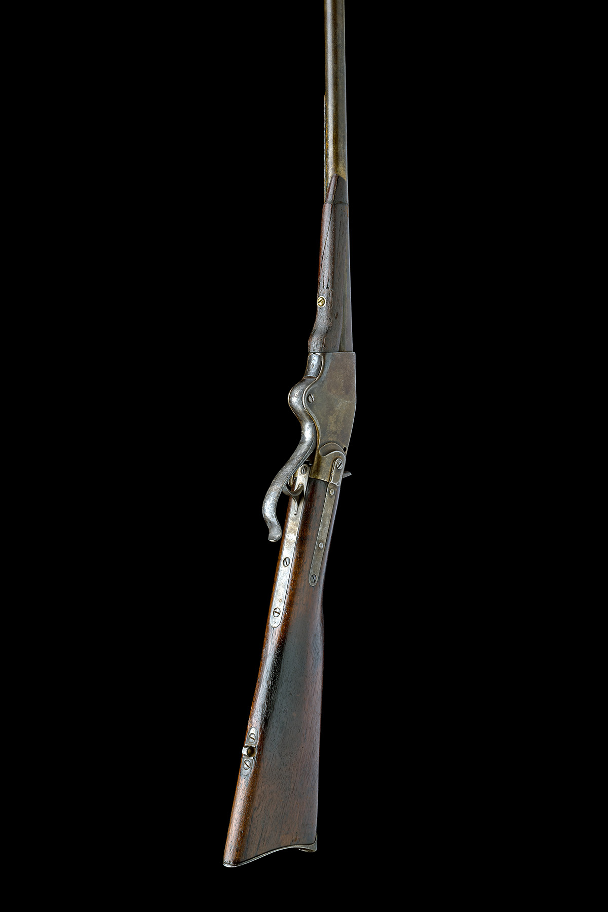 circa 1865 with 20in. six-groove barrel, block and blade front-sight, missing rear-sight, the breech end marked 'M1865' and the nocksform stamped 'SPENCER REPEATING RIFLE CO. BOSTON MA. PAT'D MARCH 6 1862 (very faint and indistinct) the wrist bearing the serial number, plain unmarked back-action lock with side hammer, walnut butt-stock, the right side marquetry inlaid with the initials 'D.C.' within a shaped border, butt missing the seven round tubular magazine, finger-lever re-modelled, badly worn and poorly repaired splinter fore-end (missing barrel band), worn throughout with other small losses