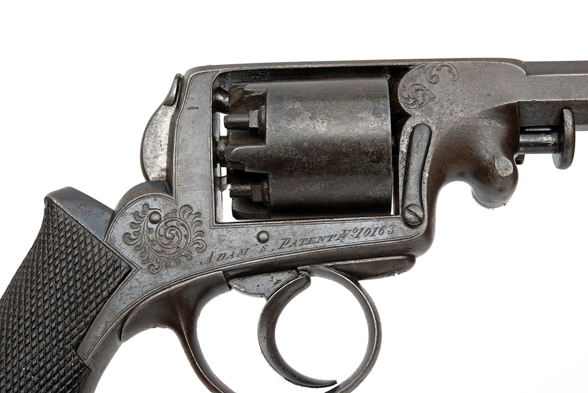 circa 1854 and being a licenced copy of the Adams, with octagonal 6 1/2in. barrel, dove-tailed fore-sight, standing notch rear-sight to the rear of the solid top-strap, borderline and scroll engraved frame, double action only mechanism with spur-less hammer, Kerr patent rammer and chequered walnut one-piece grip, in its continental market case lined and compartmented in the continental manner in red velvet (some fading and loose blocking) and complete with a full suite of accessories including mould, flask, loading rod, nipple-key, turn-screw and oil bottle