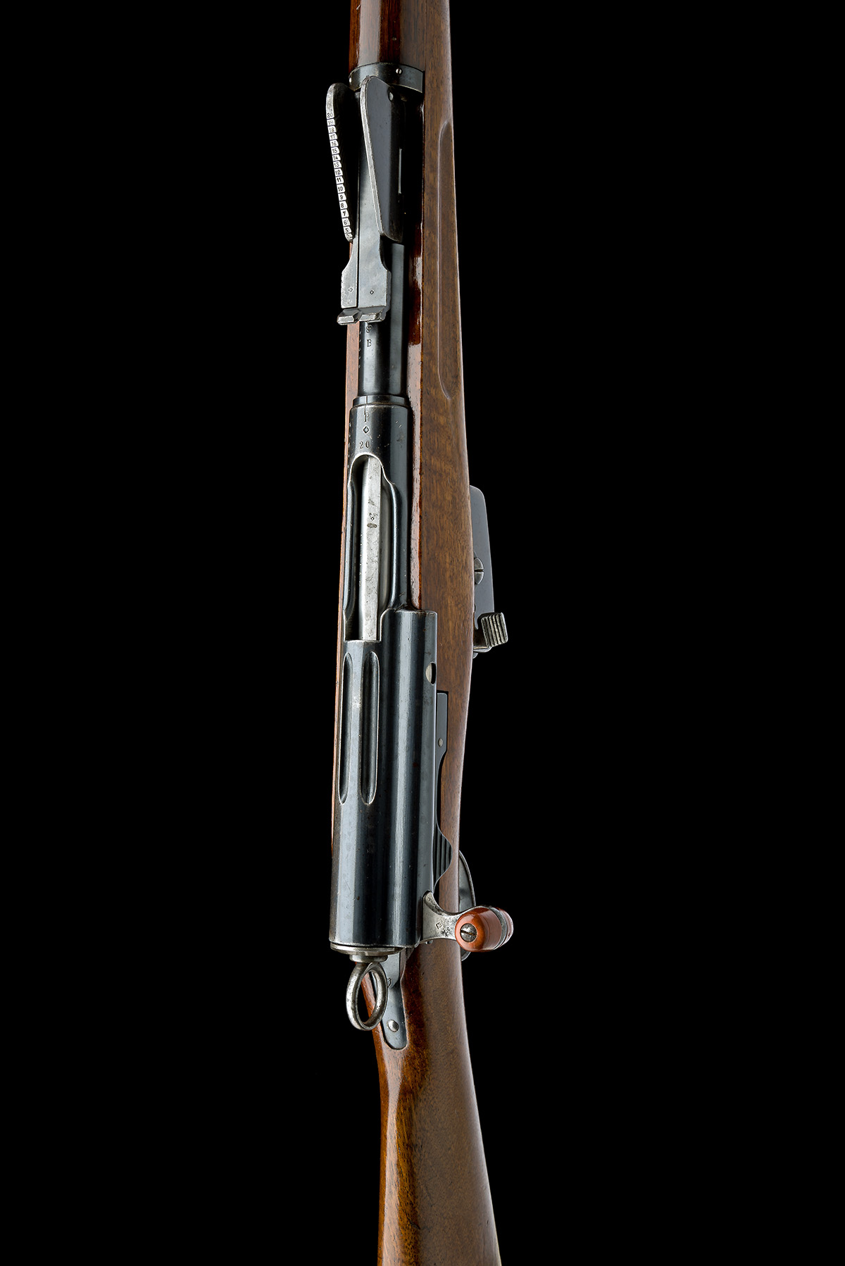 circa 1895, with blued 30 3/4in. barrel, blade fore-sight, tangent rear-sight, blind-fluted receiver with straight handled bolt fitted with bakelite toggle-ends, ring safe to rear, walnut full-stock, blued steel furniture including box magazine and twin barrel-bands, all matching visible numbers