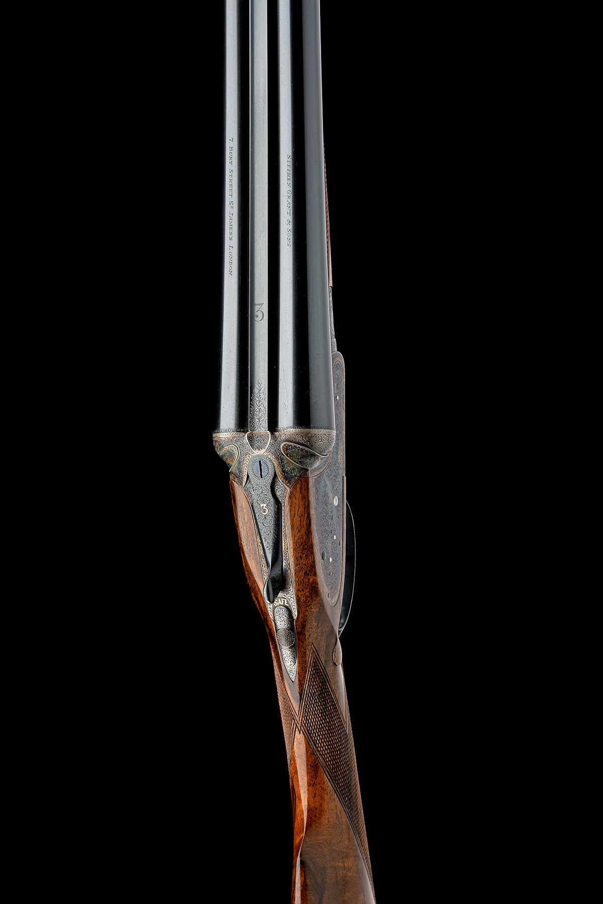 for 1912, 30in. replacement nitro chopperlump barrels (in 2001), the tubes engraved 'STEPHEN GRANT & SONS. 7, BURY STREET ST. JAMES'S. LONDON.', the rib engraved '3' at the breech end, 2 3/4in. chambers, bored approx. 1/4 and 3/4 choke, action with removable striker discs, fluted fences, the toplever gold-inlaid '3', automatic safety with gold-inlaid 'SAFE' detail, triggers set for the left hand, fine acanthus scroll engraving, retaining virtually full renewed colour-hardening and finish, 15 3/4in. figured replacement stock (cast on for the left shoulder), weight 6lb. 15oz., in a modern lightweight leather guncase with canvas and leather outer, Atkin Grant & Lang nickel oil bottle, Stephen Grant snapcaps and a Stephen Grant (Broomhill Leys address) trade label