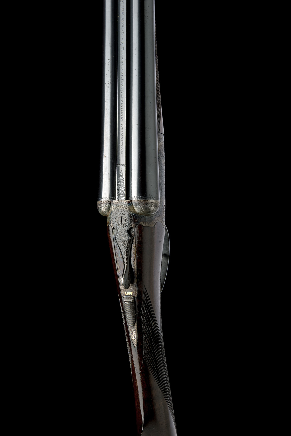 for 1973, 27in. nitro barrels, the rib engraved 'SPECIALLY MADE FOR JOHN DICKSON & SON. GUNMAKERS. EDINBURGH.', 2 3/4in. chambers, bored approx. 1/4 and 1/2 choke, scoop-back action, automatic safety with gold-inlaid 'SAFE' detail, acanthus scroll engraving with beaded bordering, the sides of the action signed 'JOHN DICKSON & SON', the floorplate with a single floral bouquet, retaining much original colour-hardening and finish, 15 1/8in. stock, weight 6lb. 5oz.