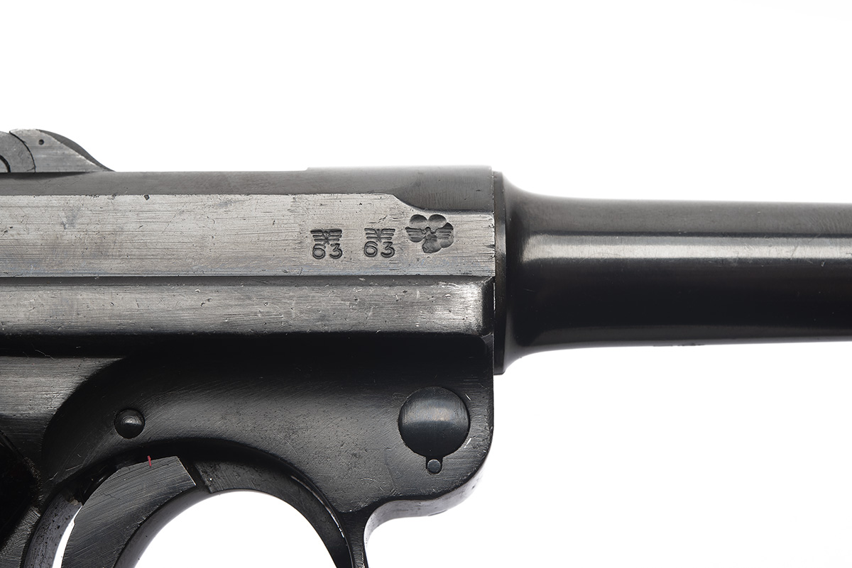 dated for 1939 but most probably an East German rework, with 4in. barrel (bulged near muzzle), blued receiver and toggle, dated receiver bridge and the toggle marked '42', blued frame, alloy based matching number magazine (matching number spare included) and chequered bakelite grips, not recommended for use
