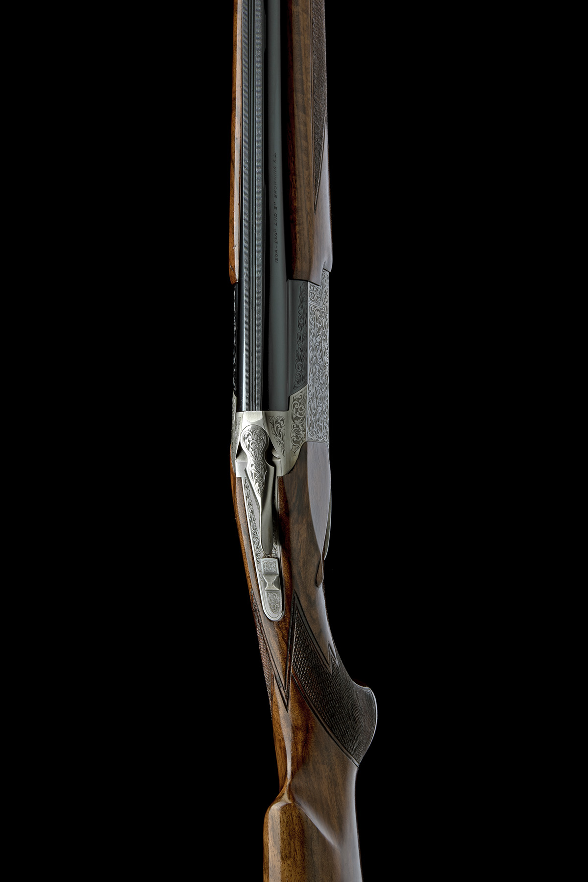 dated 2013, 30in. high performance steel proof nitro barrels with ventilated mid-rib and 10mm ventilated matt top-rib, 3in. chambers, multichokes (with spares), hold-open toplever, manual safety with integral barrel selector switch (stiff to operate), gold-washed adjustable single-trigger, profusely engraved with acanthus scrollwork on a matt background, 15in. figured pistolgrip stock including 5/8in. rubber recoil pad, right-hand palm-swell, weight 7lb. 10oz., in its makers universal case