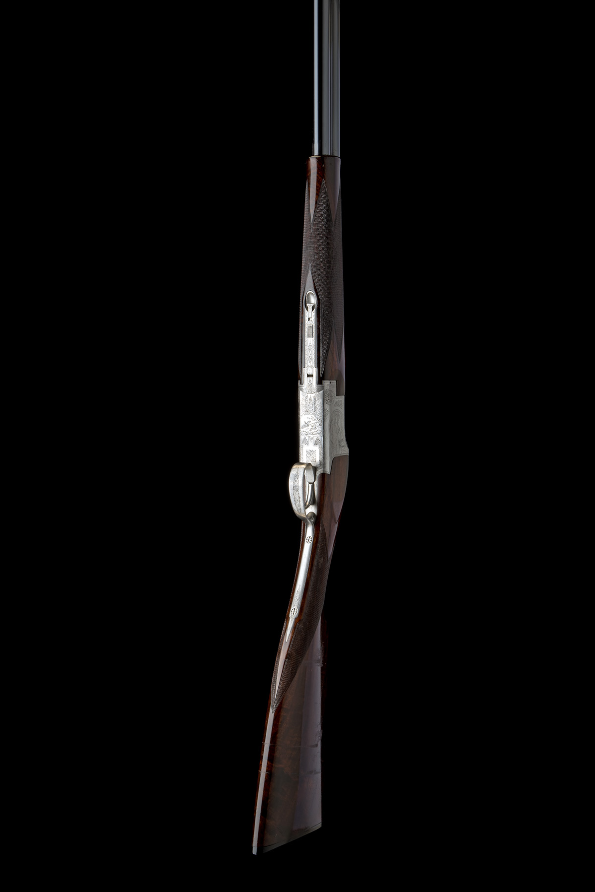 dated 1977, 26 1/4in. nitro barrels with 6mm ventilated matt top-rib, 2 3/4in. chambers, bored approx. imp. cyl. and 1/4 choke, hold-open toplever, manual safety with integral barrel selector switch, beaded border and partial acanthus scroll engraving surrounding scenes of pheasant, capercaillie and partridge, brushed finish, 14in. roachbelly stock (some tape residue) including buttplate, weight 6lb. 12oz.