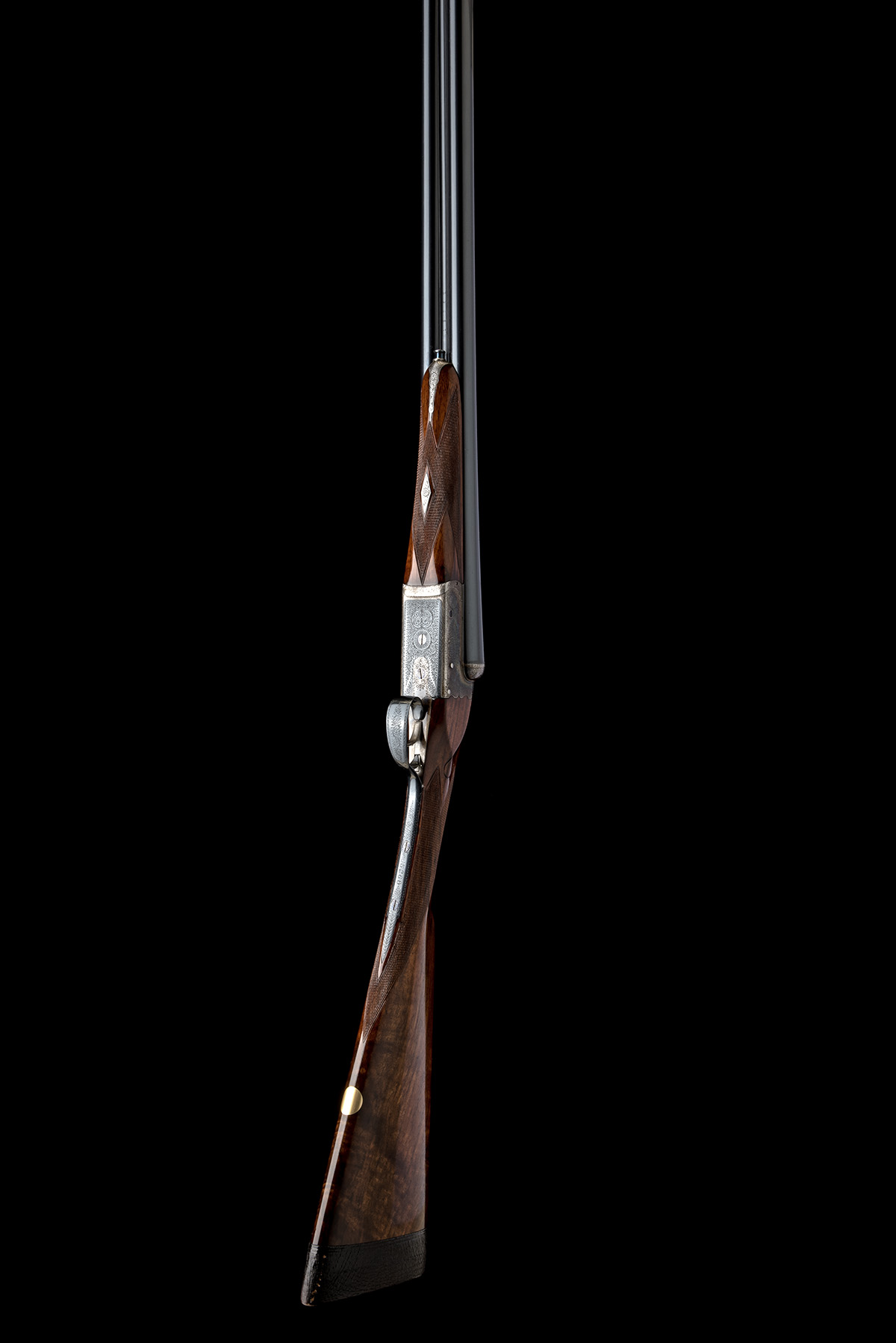 for 1932, 28in. nitro reproved barrels (in 1989), the rib engraved 'ROWLAND WATSON 17. WHITTALL STREET. BIRMINGHAM.', 2 1/2in. chambers, bored approx. imp. cyl. and 1/4 choke, scroll-back treble-grip action, automatic safety with gold-inlaid 'SAFE' detail, fine border and acanthus scroll engraving with central floral designs, retaining much colour-hardening and finish, 15in. stock including 1 3/8in. leather covered recoil pad, weight 6lb. 10oz.