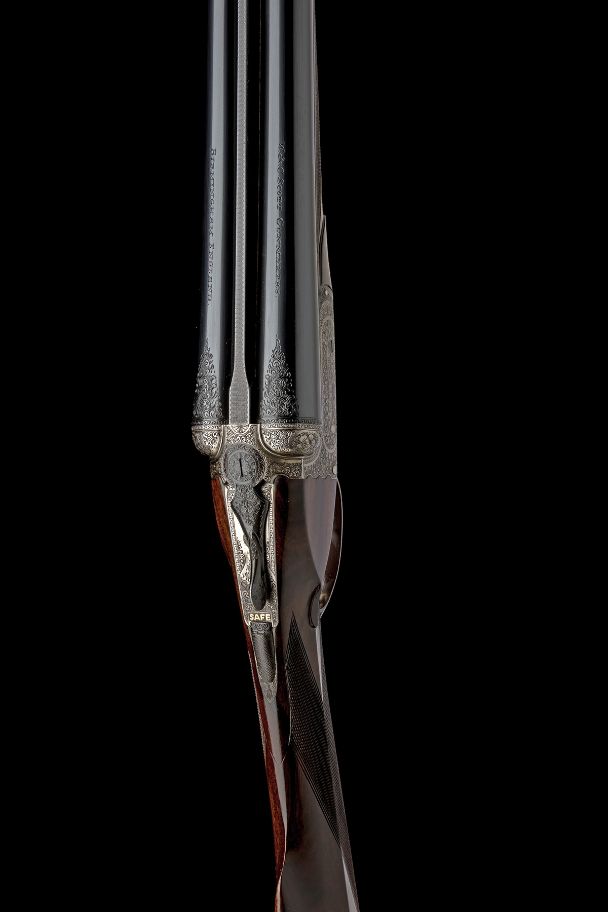 dated 1982, 28in. nitro barrels with Churchill-rib, tubes engraved 'W. & C. SCOTT GUNMAKERS. BIRMINGHAM. ENGLAND.' and with acanthus scroll detailing at the breech end, 2 3/4in. chambers, bored approx. 1/4 and 1/2 choke, scroll-back action, automatic safety with gold-inlaid 'SAFE' detail, rolled-edge triggerguard, beaded border and acanthus scroll engraving, bright finish, 15 1/2in. stock with diamond grip, bolstered fore-end, weight 6lb. 9oz., together with a green canvas slip