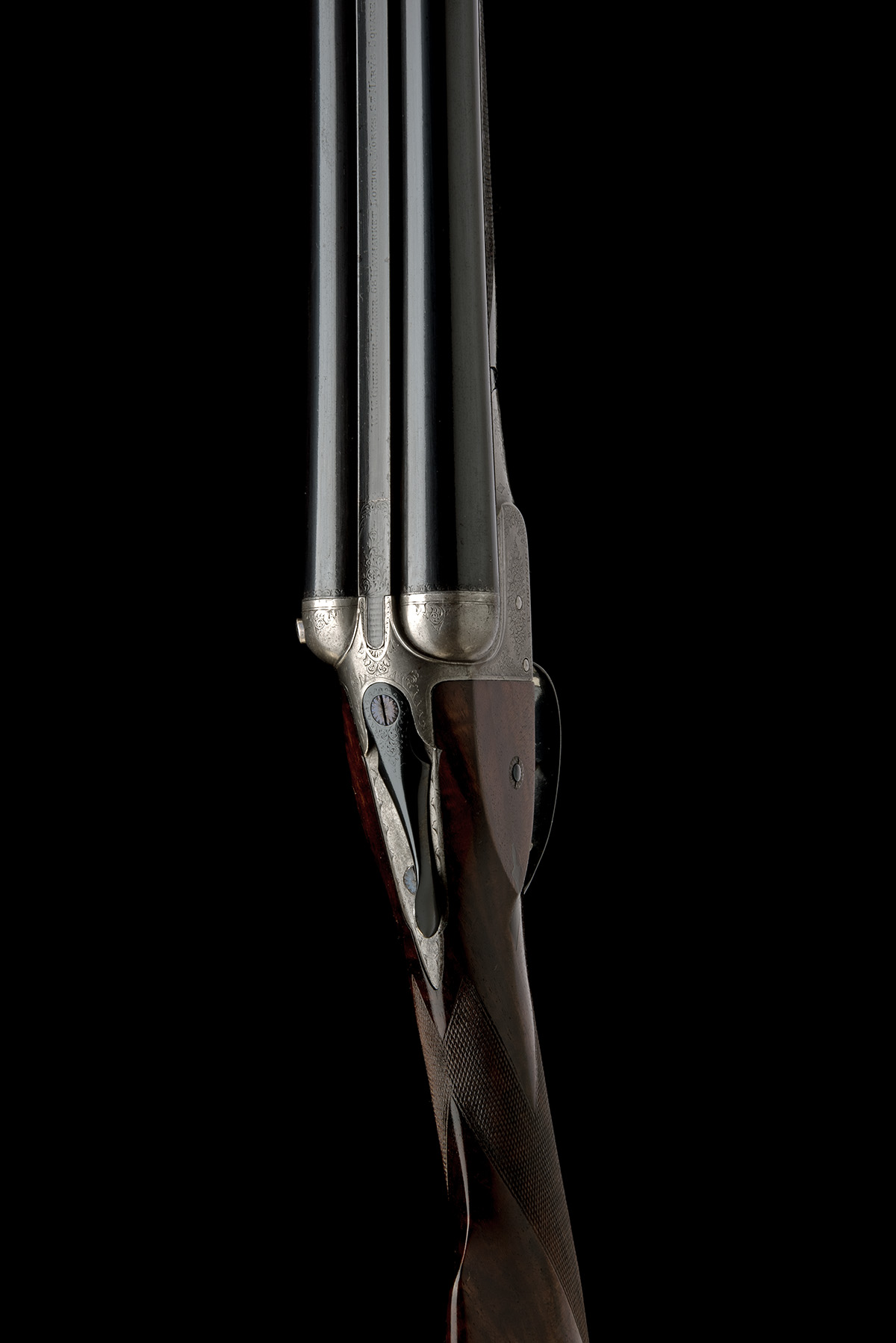 for 1912, 30in. Greener 'Elephant' trademark nitro barrels, rib engraved 'W.W. GREENER. MAKER. 68 HAYMARKET. LONDON. WORKS. ST. MARY'S SQUARE. BIRMINGHAM.', 2 1/2in. chambers, bored approx. 1/2 and full choke, treble-grip action with fluted bolsters, manual side safety, border and partial scroll engraving, 14 3/4in. figured replacement stock with ornate inlaid drop-points, weight 6lb. 11oz., in its makers brass-cornered oak and leather case