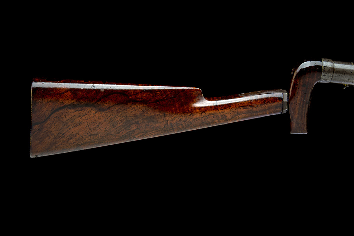 English circa 1860, with brushed bright working replacement turn-off 28 1/2in. barrel, bead fore-sight, Birmingham proofs, plain tubular action with pan-head under-hammer and automatic trigger, cranked walnut walking-stick handle with iron reinforcement, the rear of grip with threaded aperture to accept the detachable walnut butt-stock
