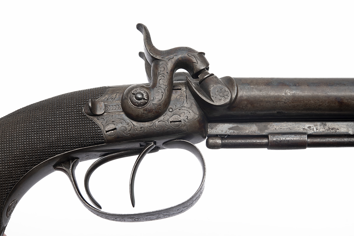 A 54-BORE PERCUSSION DOUBLE-BARRELLED TRAVELLING PISTOL SIGNED J.W. EDGE, MANCHESTER, no visible serial number,
