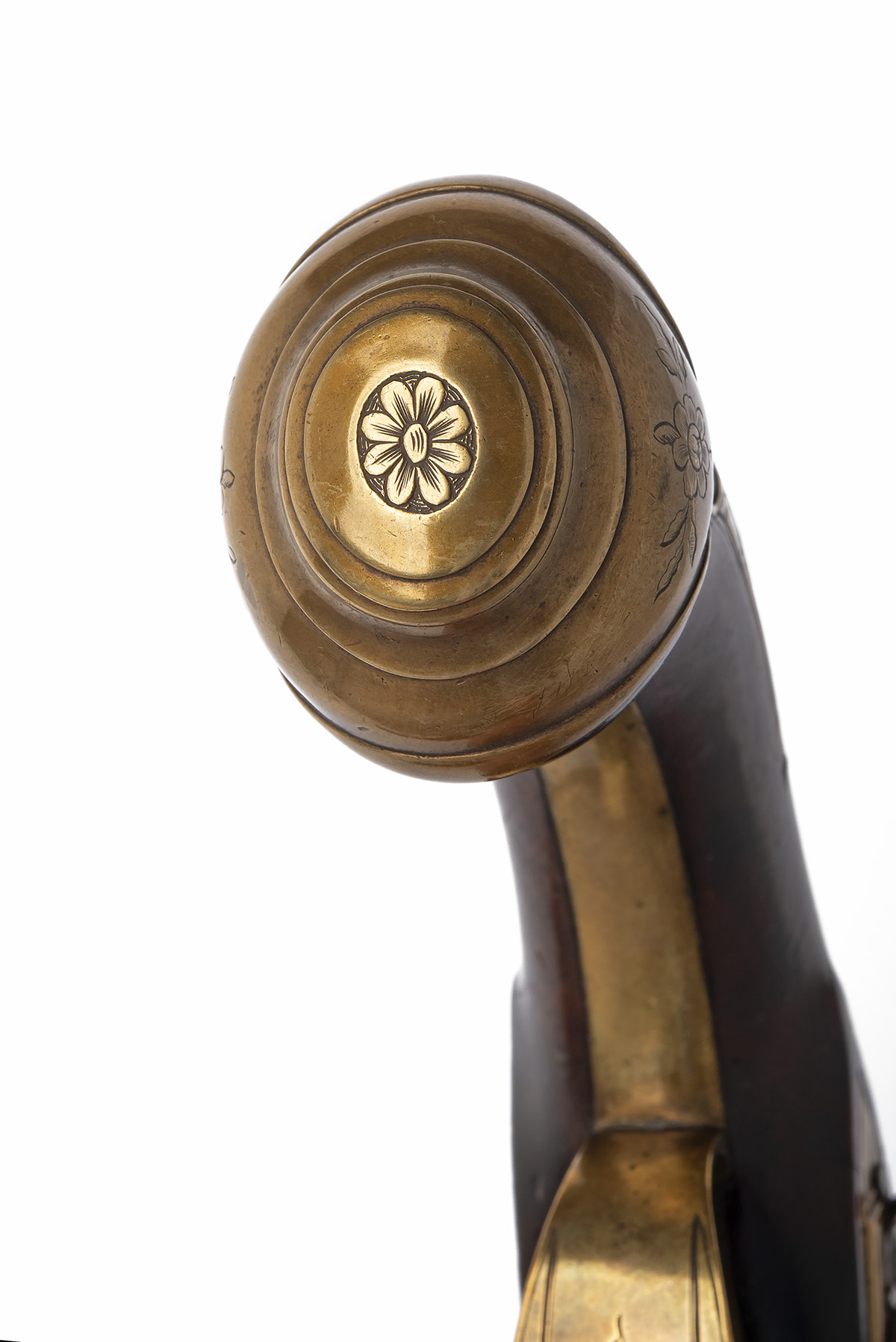 circa 1785, with brass two-stage slightly swamped 8 1/2in. barrels, moulded girdles at the intersection, iron top-tangs, flat brass lockplates with pointed and stepped tails, iron swan-necked cocks with bolted safes, bridled pans with 'J. PROBIN' signature below, walnut full-stocks with brass furniture including engraved butt-caps with long side-spurs, pillar fronted trigger guard bows, pineapple finials and horn tipped wood ramrods