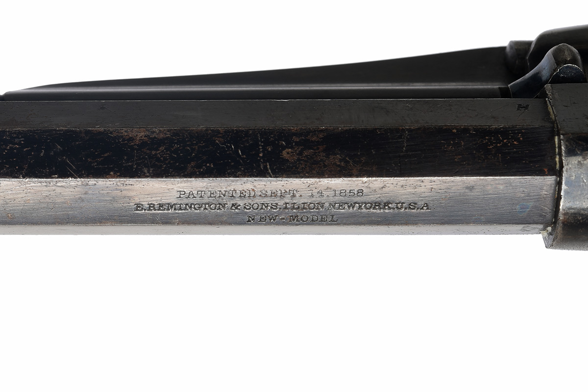 with blued octagonal 8in. barrel signed on the top-flat 'PATENTED SEPT 14 1858' over 'E. REMINGTON & SONS, ILION, NEWYORK U.S.A.' over 'NEW MODEL', blued solid frame, blued plain six-shot cylinder, smooth flared walnut grips with martial cartouche, brass trigger guard, blued rammer and trigger, colour hardened hammer, much original finish remaining