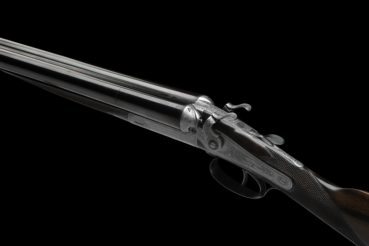 for 1879, 26in. sleeved nitro barrels (in 1969), the rib re-engraved 'CHARLES LANCASTER NEW BOND STREET LONDON "PATENT BREECH LOADER"' and gold-inlaid '2' at the breech end, 2 1/2in. chambers, bored approx. 1/4 and 3/4 choke, carved fences, striker discs, ornate manual tang safety with 'SAFE' detail, rebounding back-action locks with low-spurred hammers of hare's-ear form, the breasts of the hammers striking the firing pins, sidelever cocking, fine acanthus scroll engraving with ornate bordering, the lockplates with 'CHARLES LANCASTER'S PATENT. LONDON.' in scrolling banners, the action bar with 'CHARLES LANCASTER'S PATENT' to the sides, brushed bright and reblued finish overall, 14 3/8in. highly-figured stock including scroll-engraved ebonite buttplate, Hackett snap fore-end with shaped finger recess at the tip, the heel of the stock and the fore-end with oval white-metal escutcheons numbered '2', the stock with oval escutcheon bearing the Hermon family crest, weight 6lb. 2oz., with a Teales fleece-lined leather slip