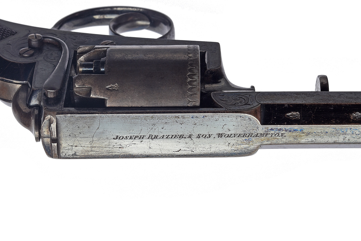 circa 1853, with blued octagonal 6 3/8in. barrel, dove-tailed fore-sight, borderline and scroll engraved frame, the solid top-strap signed 'JOSEPH BRAZIER & SON, WOLVERHAMPTON' and with notch rear-sight to rear, double-action mechanism with spurless hammer, plain five-shot cylinder (traces of colour) and with engraved band to leading edge, chequered walnut grip with shallow domed and engraved butt-cap with central trap, no provision for rammer, much finish remaining and complete with an oak storage case lined and compartmented in green velvet (possibly a good reproduction) and including a mould marked 'ADAM'S PATENT', a cleaning/loading rod, bag-shaped flask, cap tin, oil bottle, nipple key and turn-screw, the inside of lid with a reproduction parchment R. Adams trade-label